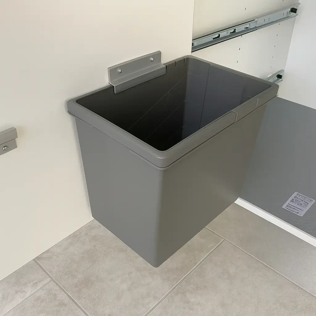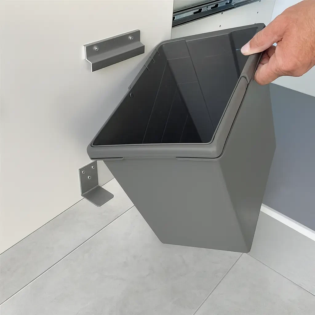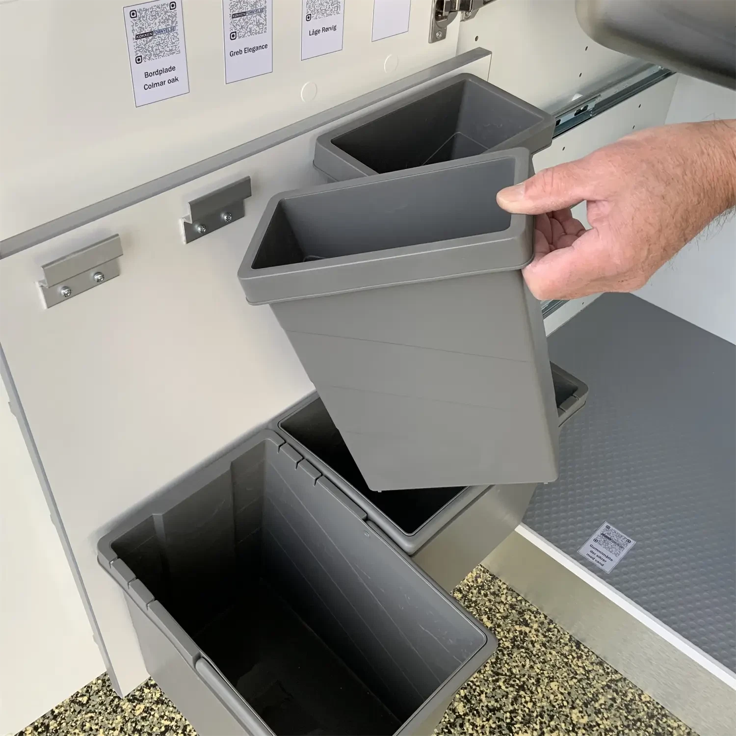 Affaldssystem består af 3 små spande p hver 3L og 2 Quartet spande på hver 11L, som hænges op på en udtræksplade med beslag – så du nemt kan trække spandene ud og smide affald i. Det er nemt at tage spandene af og på, når de skal tømmes og ved rengøring.