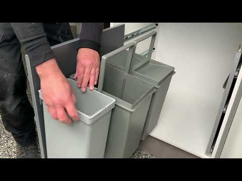 Affaldssystem består af 1 Københavner spand 10L og 2 Quartet spande på hver 11L, som hænges op på en udtræksplade med beslag – så du nemt kan trække spandene ud og smide affald i. Det er nemt at tage spandene af og på, når de skal tømmes og ved rengøring.