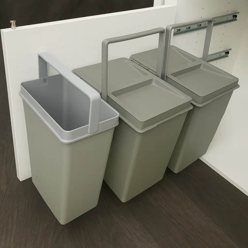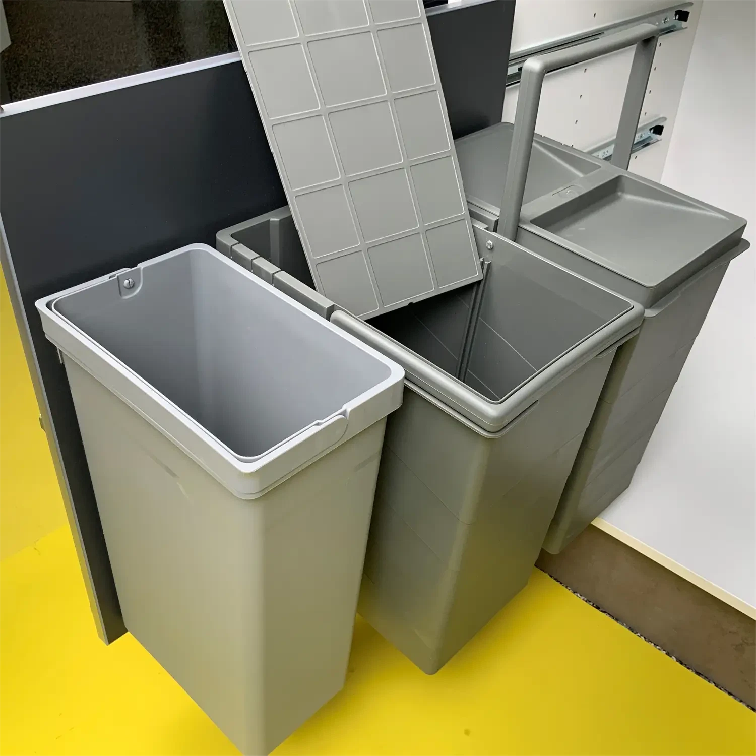 Du kan bygge et affaldssorteringssystem, der passer præcist til din skabsbredde, dit behov for sortering og din indretning.