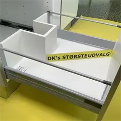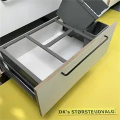 - Er skuffen 60 eller 80 cm bred, så der er plads til et affaldssystem, som sættes ned i skuffen med sorteringsspand i.