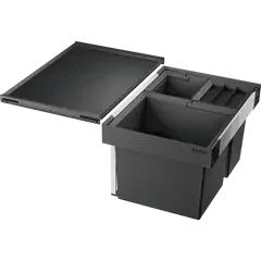 - Affaldssystem til at sætte ned i skuffen. Her kan du vælge mellem forskellige sorteringsspande, størrelser samt med eller uden låg.