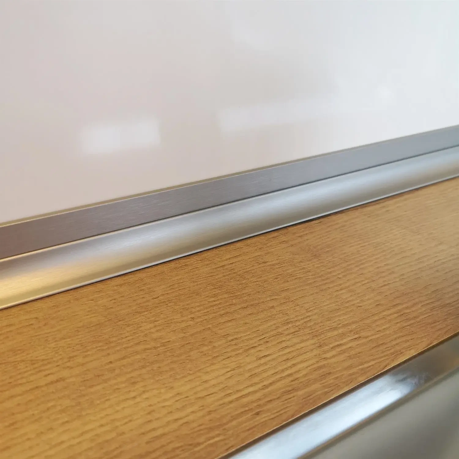 Derefter kan der sættes en alu hulkehlliste på, i samme farve, som afslutning mod bordpladen. Herved får man en rigtig flot afslutning mellem bordpladen og væggen. Alulisten er desuden særdeles rengøringsvenlig, hvilket letter den daglige rengøring i køkkenet.