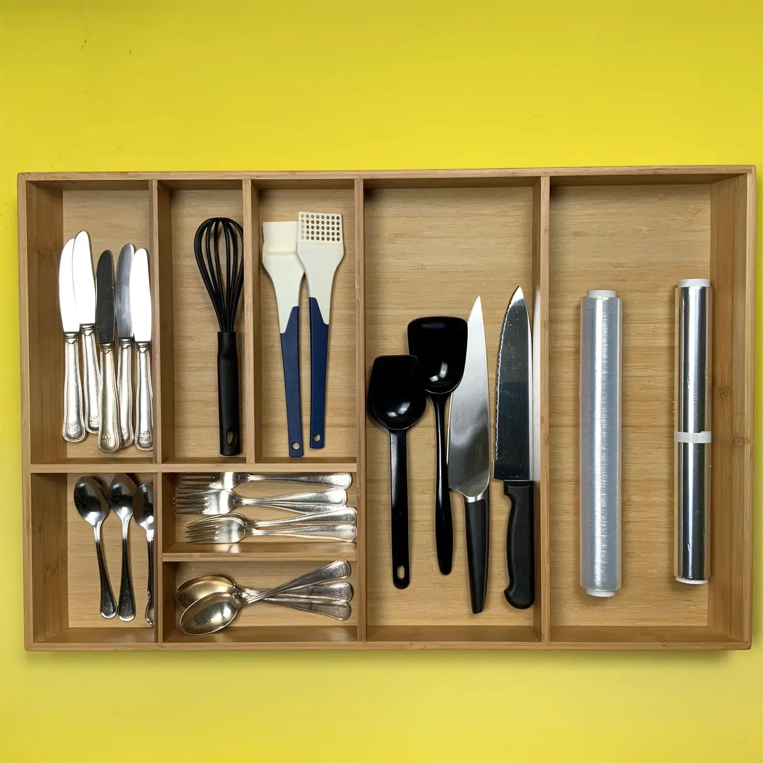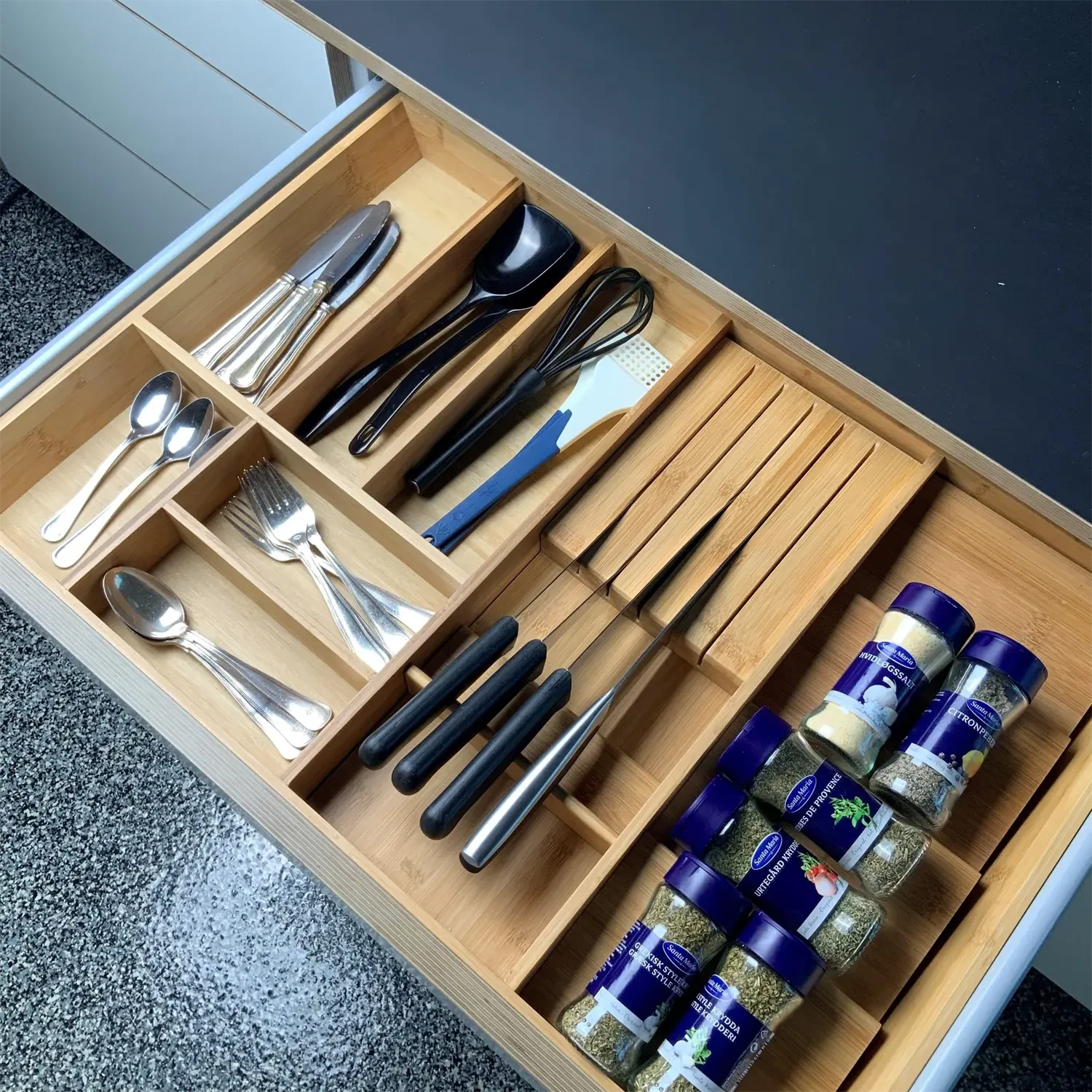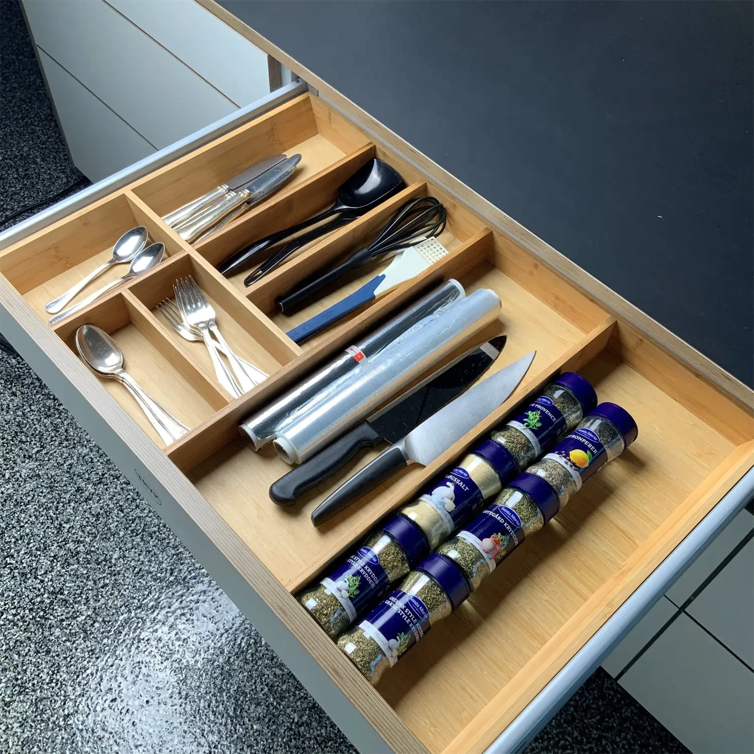 Den største bestikindsats model i massivt og lakeret bambus. Her får du 8 rum til at sortere bestik, knive og krydderier i. Her kan tilkøbes knivindsats og krydderiindsats for montering i hver af de 2 større rum, hvis dette ønskes. Find disse ved at rulle ned på siden, til relaterede varer.