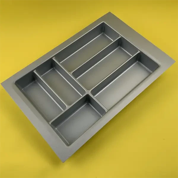 Denne bestikindsats til skuffe er lavet i speciel kraftig, slagfast og slidstærk plast. Bestikbakken er meget aftørringsvenlig og i en let blank, grå metallic farve.