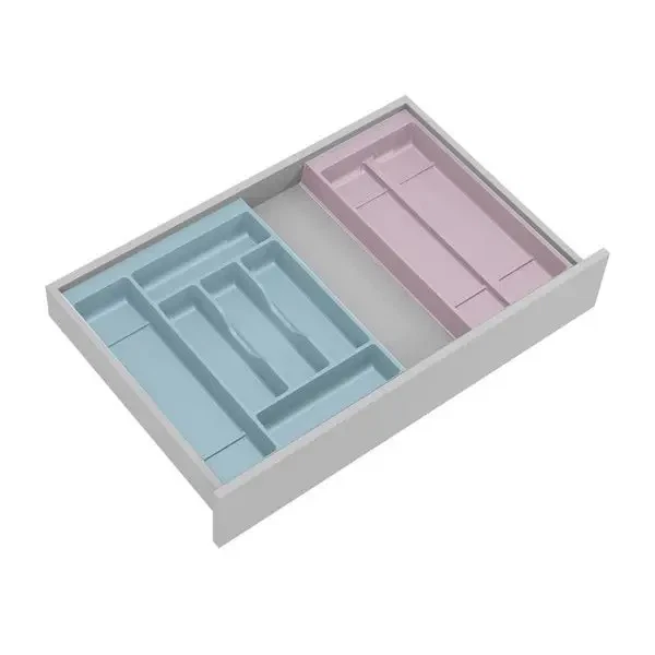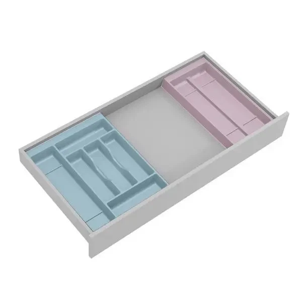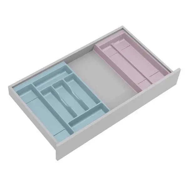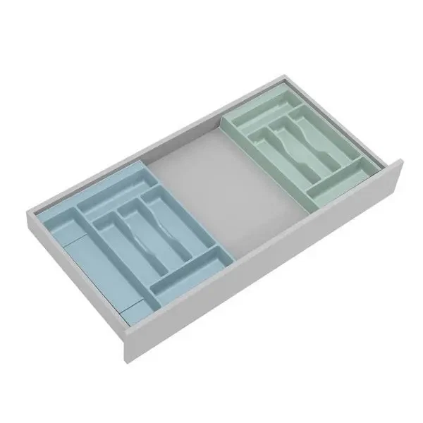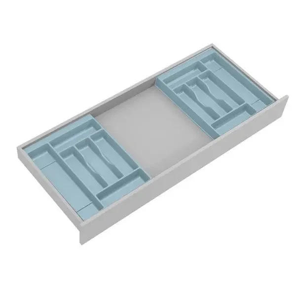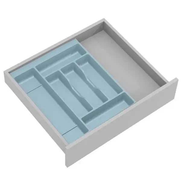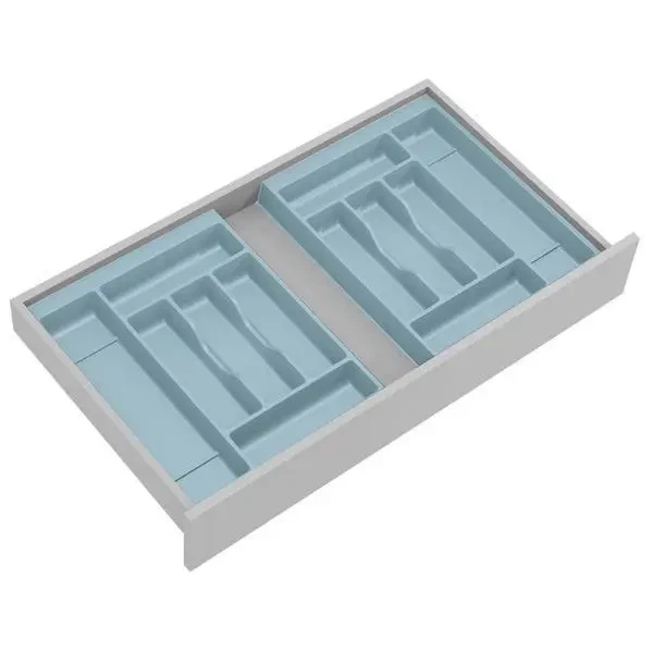 Eksklusiv plastik bestikindsats der passer i skuffer fra 50 cm i bredden. Bestikbakken placeres mod den ene skuffeside og resten af skuffen kan anvendes til fx store køkkenredskaber, staniol og husholdningsfilm. Bestikindsatsen har en lukket side der vender ud mod rummet i skuffen. Det er derfor ingen problem at ligge løse redskaber ved siden af da de ikke vil kunne trille ind under skuffeopdeleren.