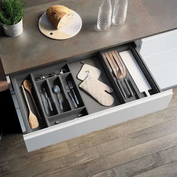 Bestikindsats til min. 50 cm skuffe i mørk grå plast (placeres til højre/venstre i skuffen)