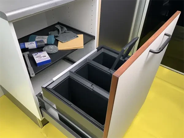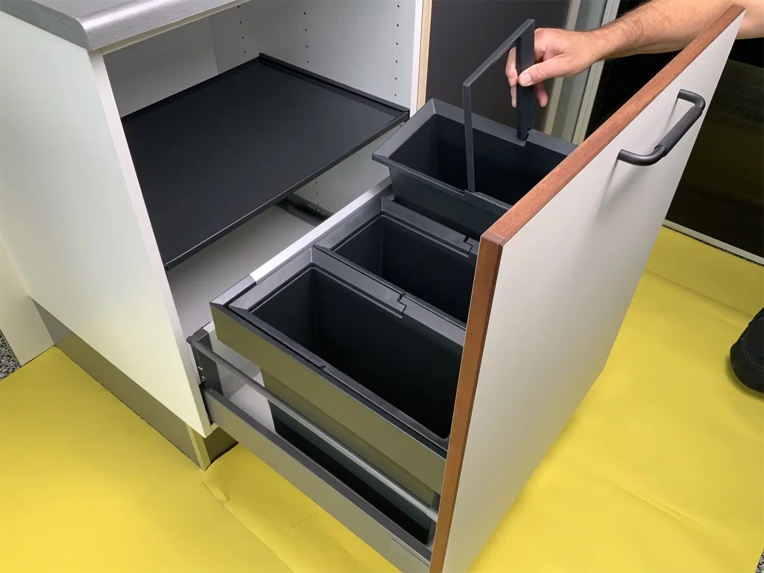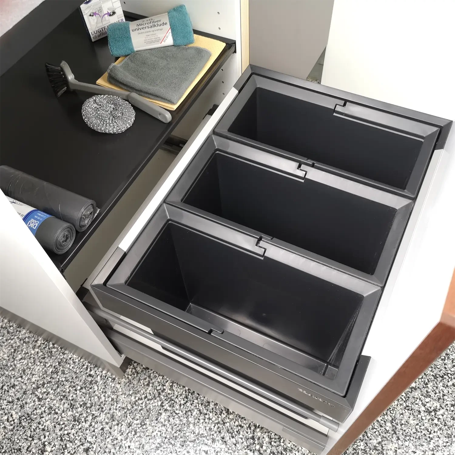 Det funktionelle affaldssystem har 3 store spande, som alle kommer helt frem så snart skuffen åbnes. Så bliver det ikke nemmere at sortere.