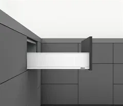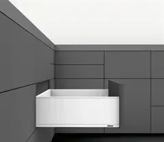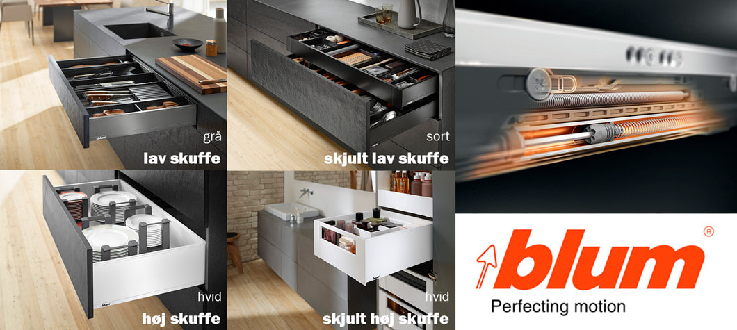 Blum legrabox er lavet af flotte materialer og gør hverdagen i køkkenet mere lækker. Du kan få lav skuffe, høje skuffer og skjulte skuffer i farverne hvid, mørk grå og sort.
