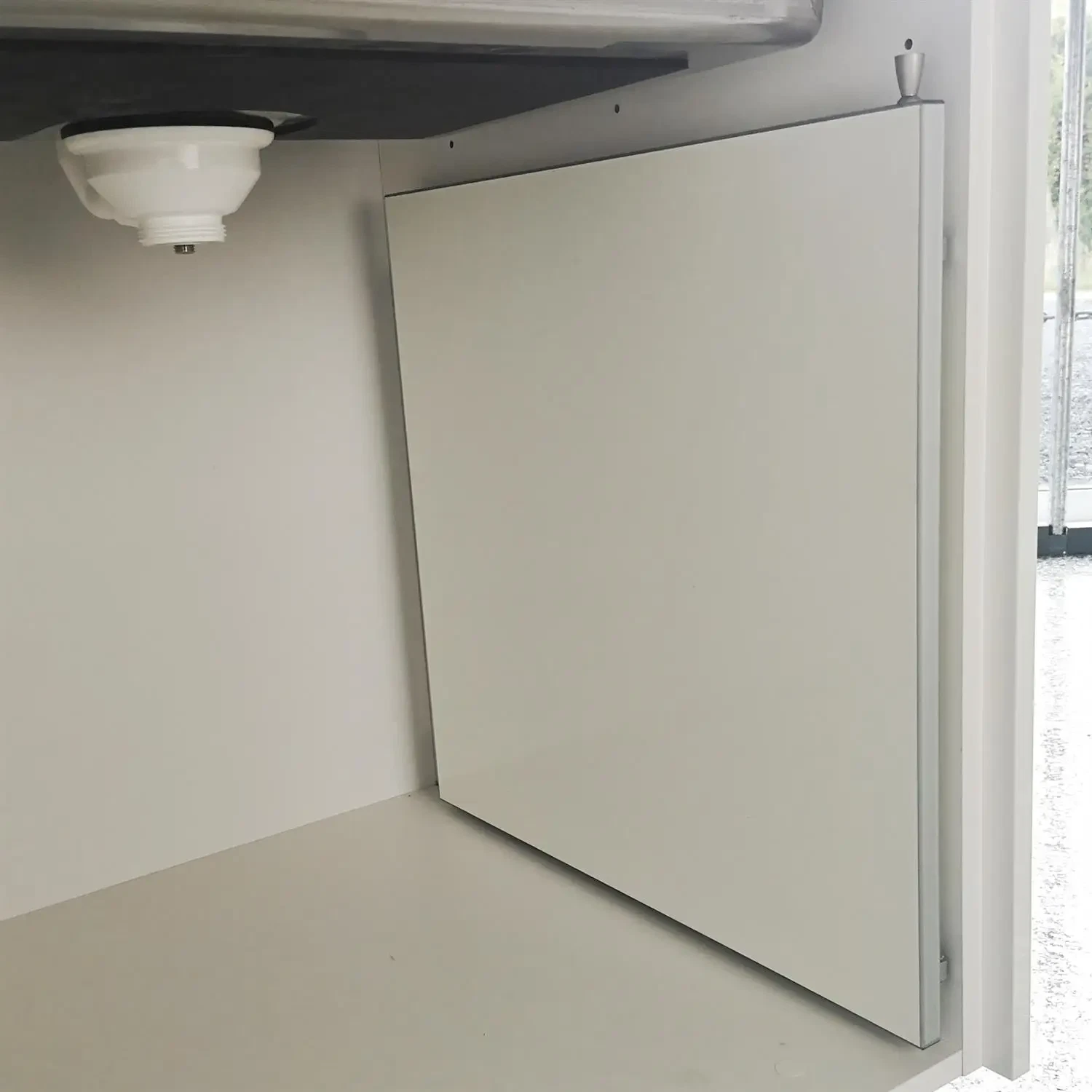 - Du kan lave en meget smal / dyb løsning, en meget bred løsning eller en L-formet løsning med en smal spand inderst og en bred spand yderst, f.eks. for at undgå afløbsrør i skabet