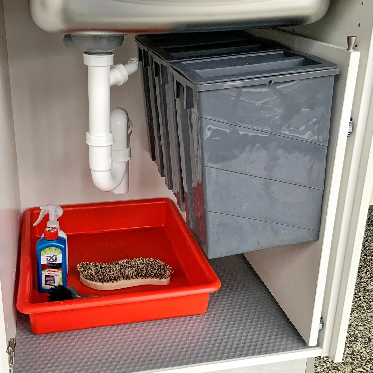 Vend pladen så den passer i dit skab, og har plads til alle spande.