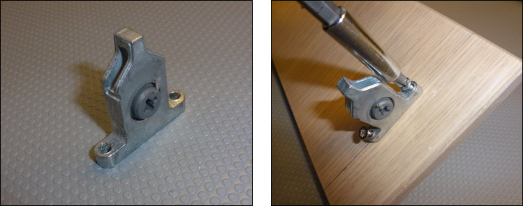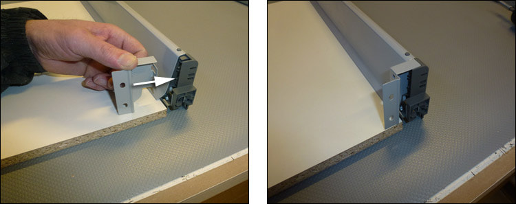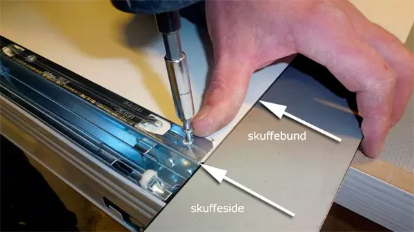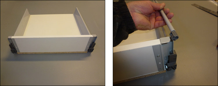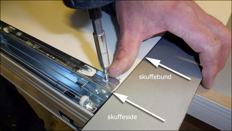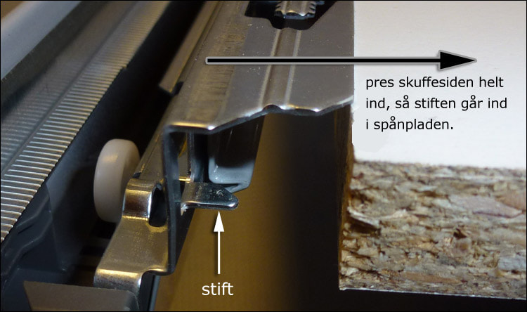Bemærk stiften i falsen på skuffesiden - den skal presses i bund i spånpladen.