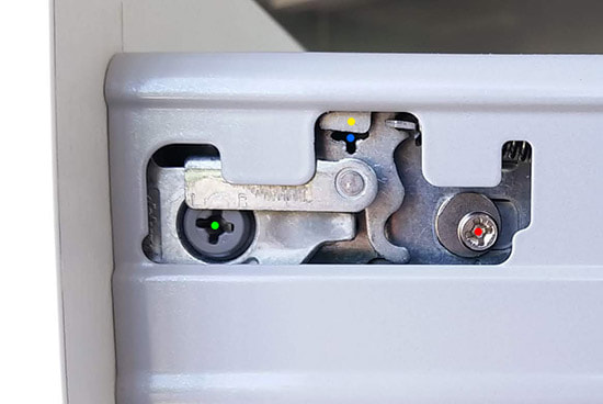 Den gule og den blå får du kun brug for ved afmontering af forstykket. Skub da den lille gule plade opad med en skruetrækker, så du kan stikke skruetrækkeren ind i det blå, plus-formede hul. Med skruetrækkeren kan du nu vippe pladen og forstykket afmonteres.