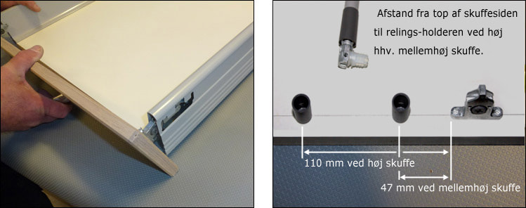 Nu kan forpladen meget nemt klipses direkte på skuffen og hvis det drejer sig om en høj skuffe, monteres den lille holder til relingen 110mm hhv. 47mm fra overkanten af skuffeside (se billede herunder).