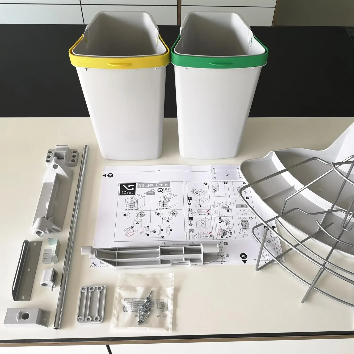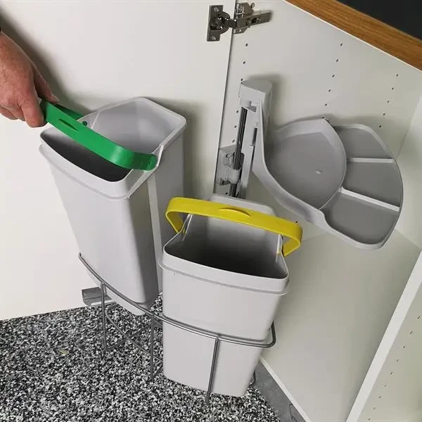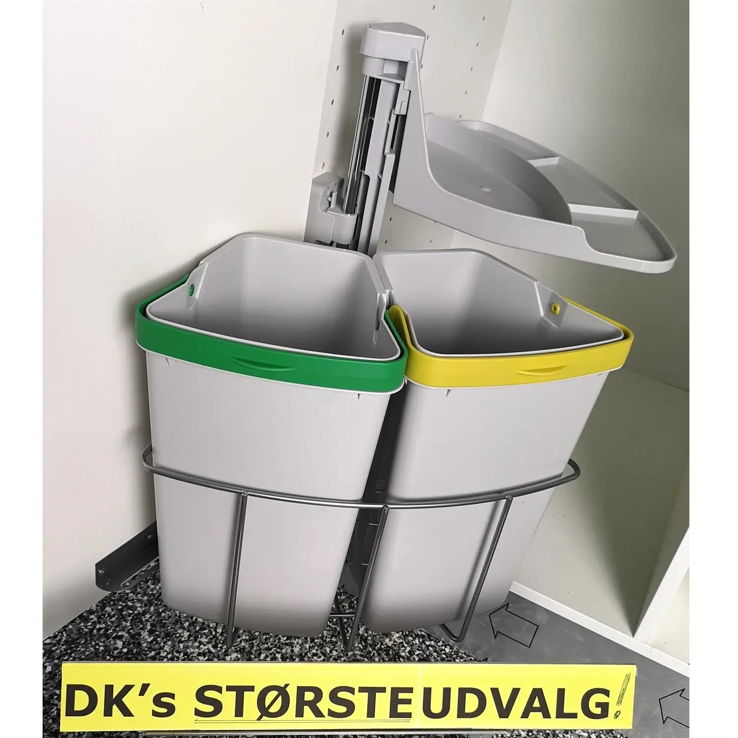 Flot og anderledes affaldssystem med to spande, som kun fylder 35 cm i bredden og dybden. Spandene er nemme at løfte ud af det solide stativ. Låget er stationært, og når man åbner køkkenlågen, bliver låget derfor i skabet, mens affaldssystemet drejer ud.