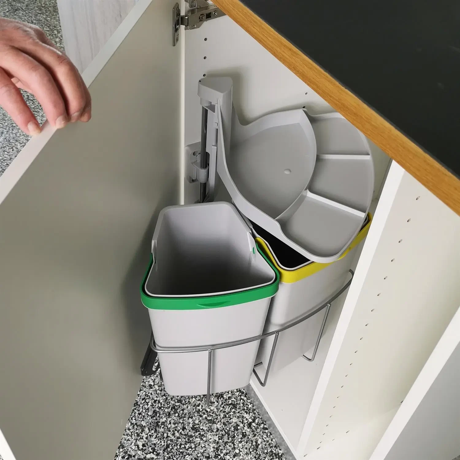 Fordi affaldssystemet er cirkelformet (en kvart cirkel set fra oven), støder det ikke ind i genstande der måtte stå inde i skabet, når man drejer det ud.