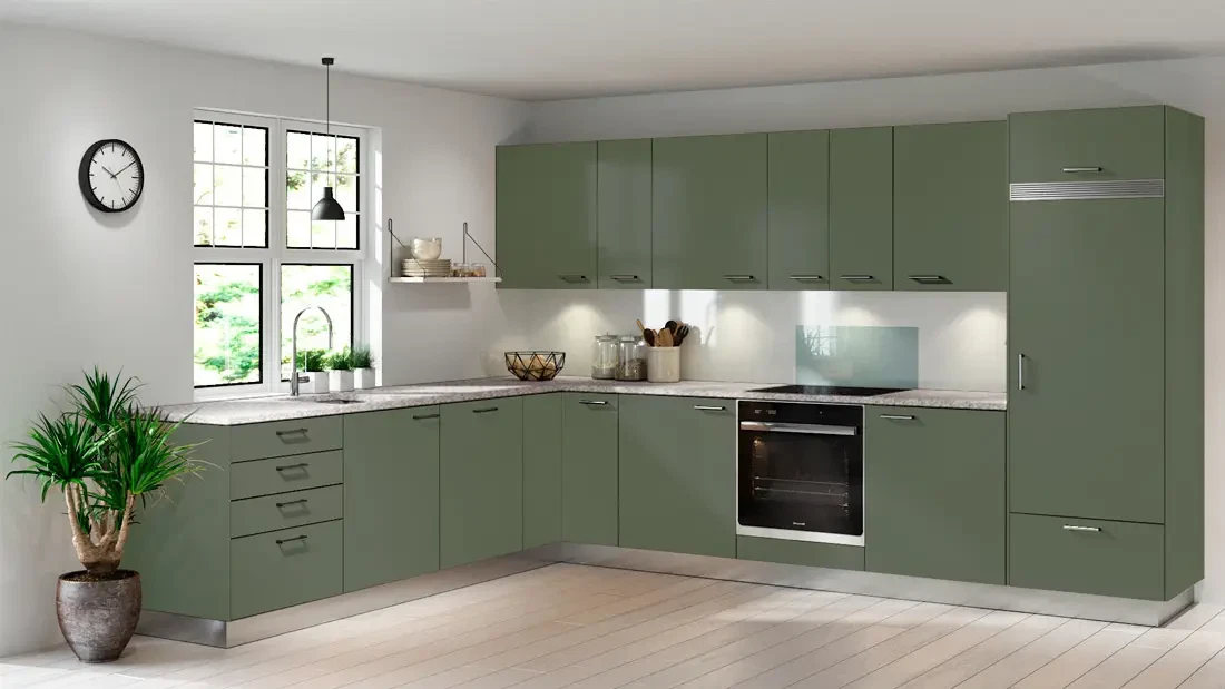Hjortø køkkenlåger og fronter efter dine mål - oliven grøn højtrykslaminat med kant af træ [Pris F]