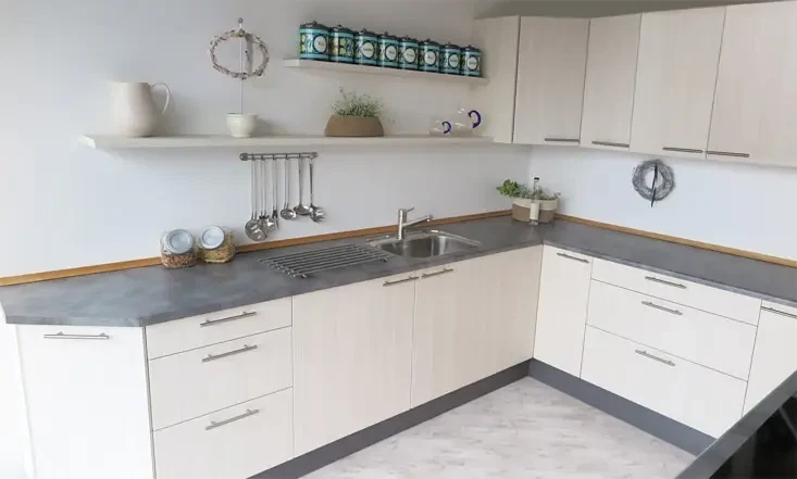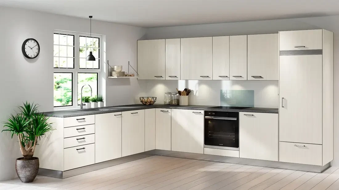 Hvide Sande lågen er en slidstærk køkkenlåge af microlaminat og kraftige ABS kanter. Har en lys og behagelig nordisk farve af lys ask og træstruktur som kan mærkes med fingrene.