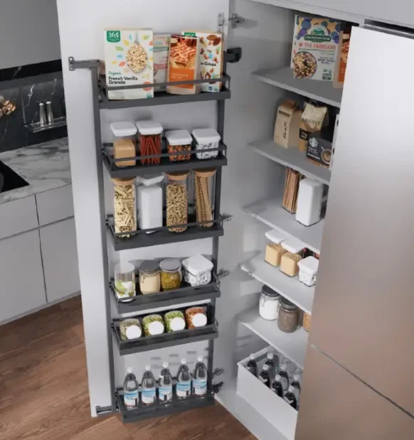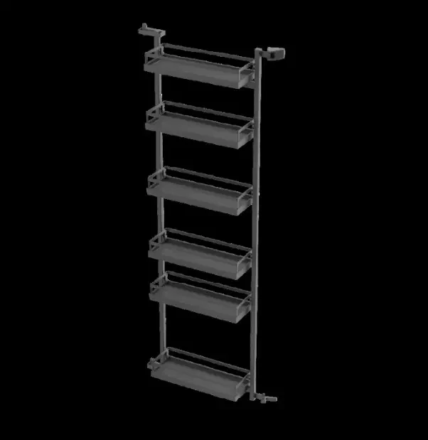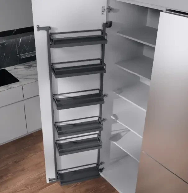Revolutionerende løsning til højskabet i køkken eller bryggers. Sikrer dig optimalt overblik og nem adgang til indholdet i skabet, da indholdet nu kan fordeles på både skabshylder og i kurve på lågen. Kurvene er højdejusterbare.