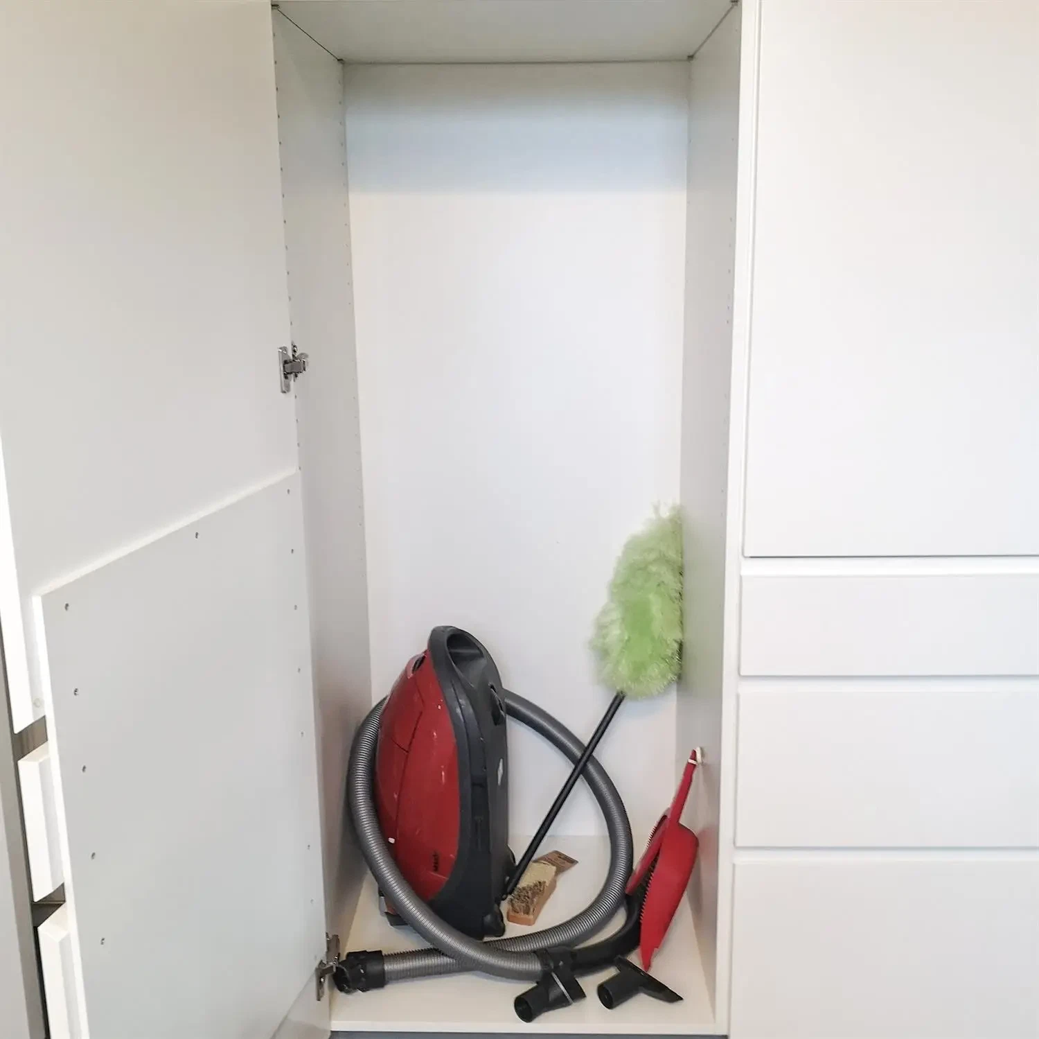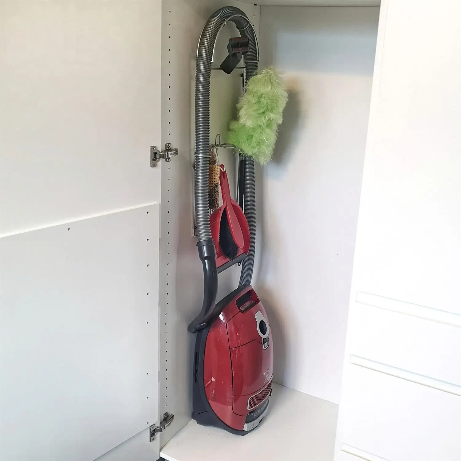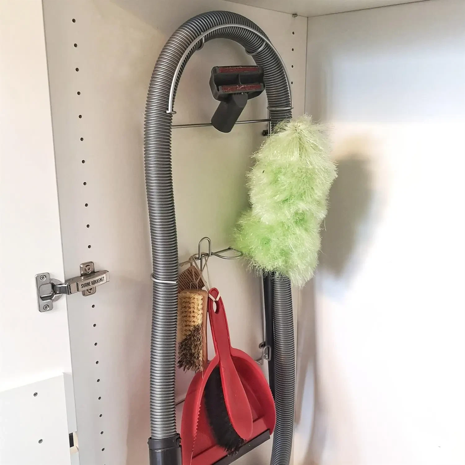 Stativ til kosteskab til opbevaring af tilbehør til støvsuger mm. i skab. Giver mere plads og orden i et rodet kosteskab.
