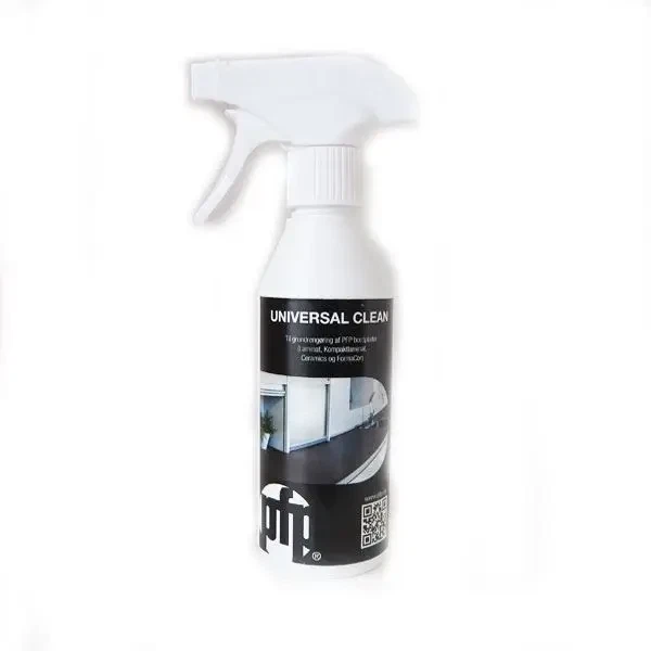 Til grundrengøring af fx laminat bordplader og låger mm. Denne Universal Clean påføres overfladen ufortyndet med en fnugfri klud. Ved ruflede overflader kan man med fordel anvende en blød opvaskebørste. Lad det virke i ca. 5 min.