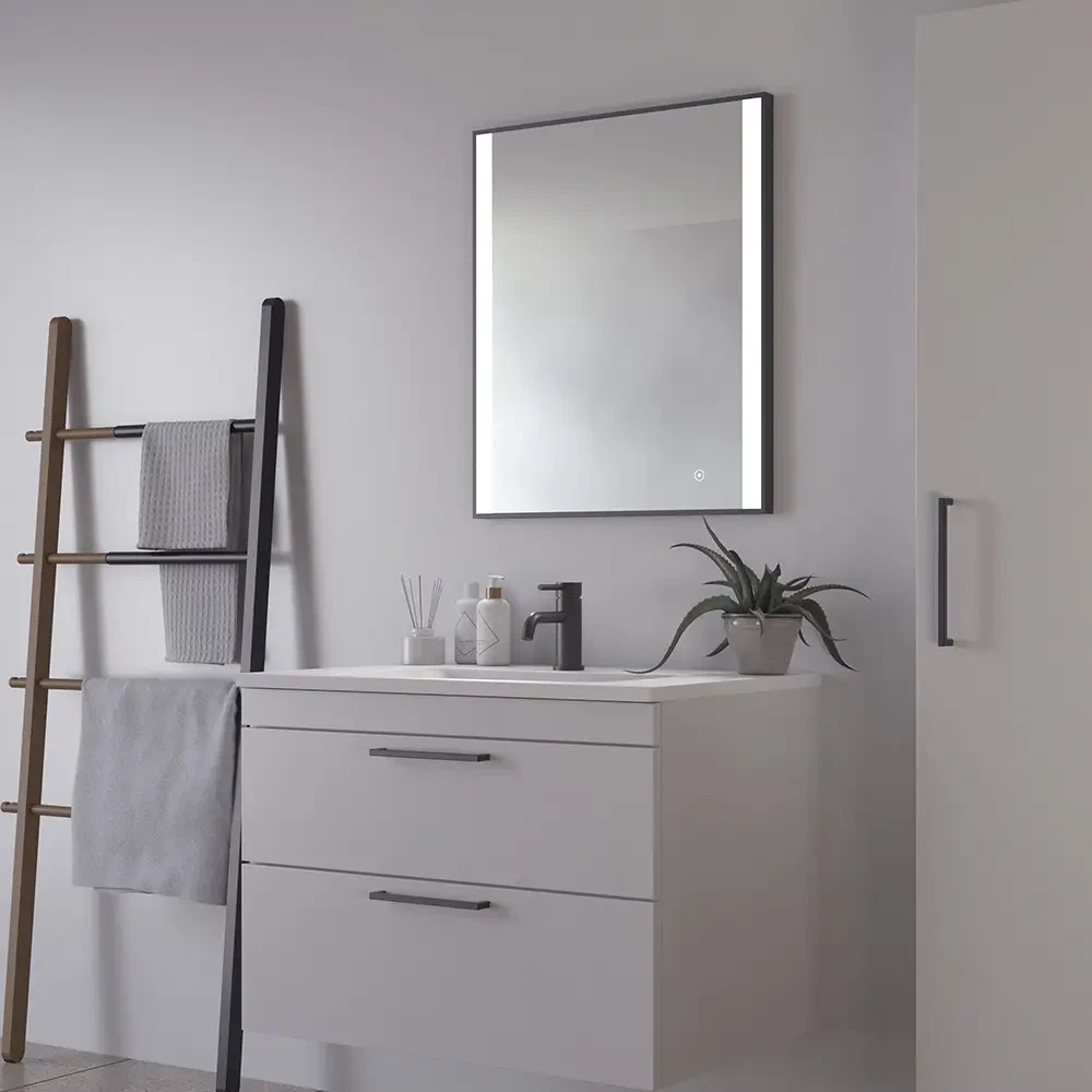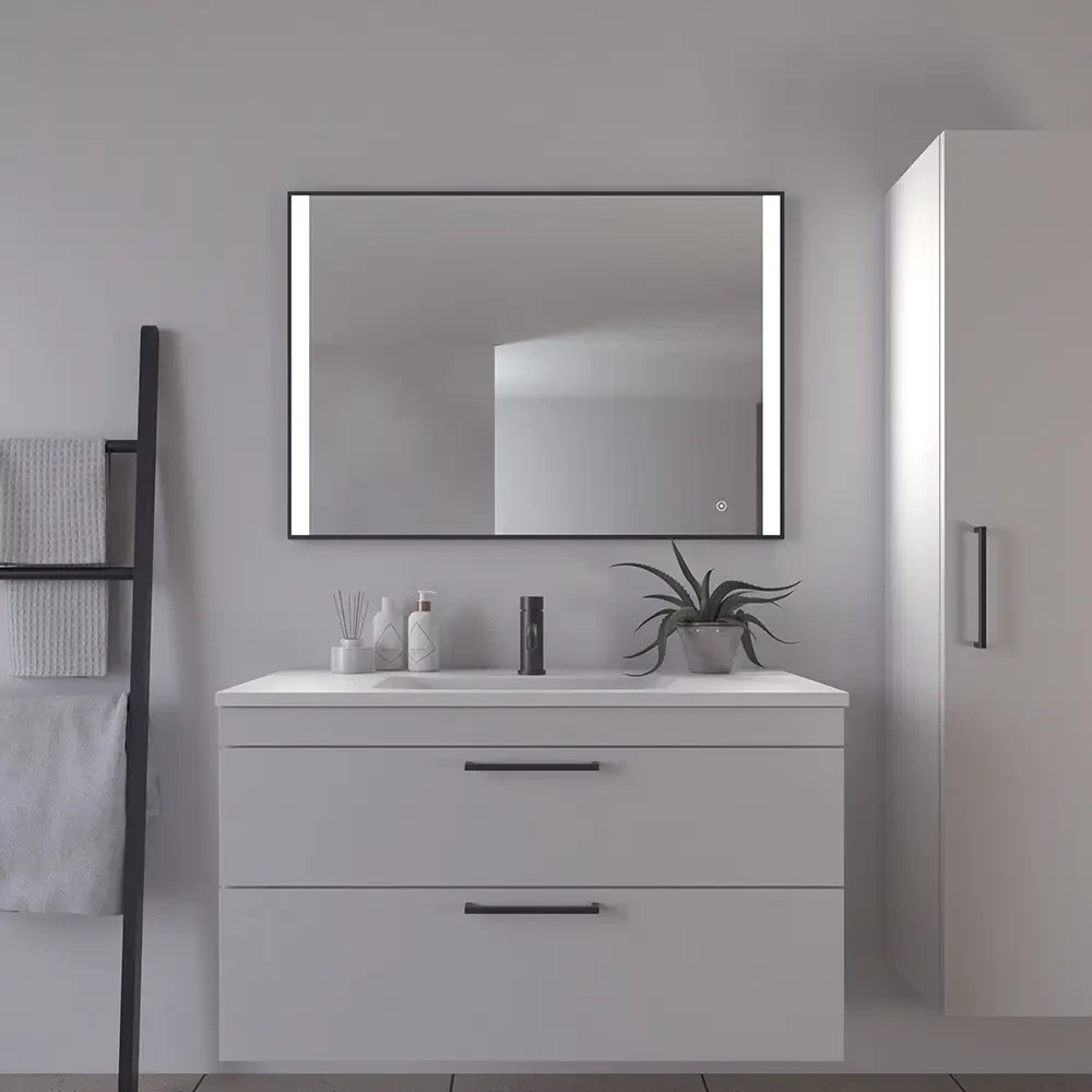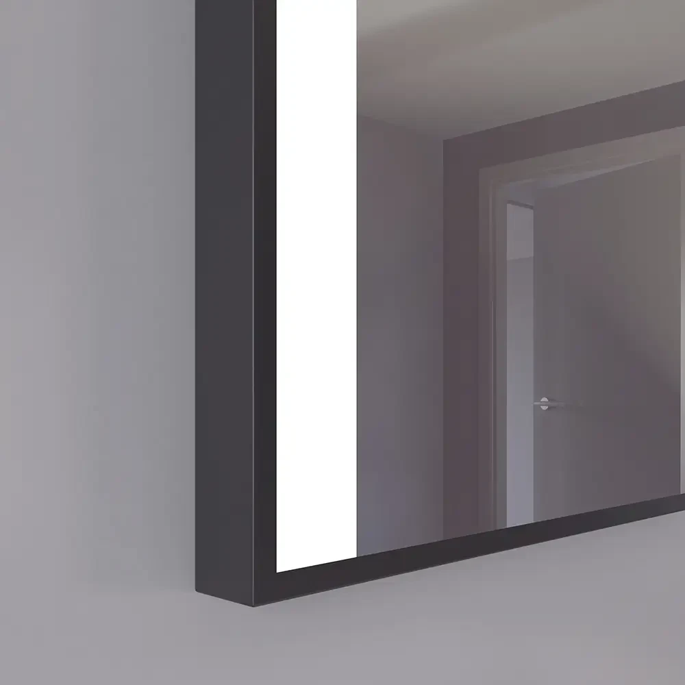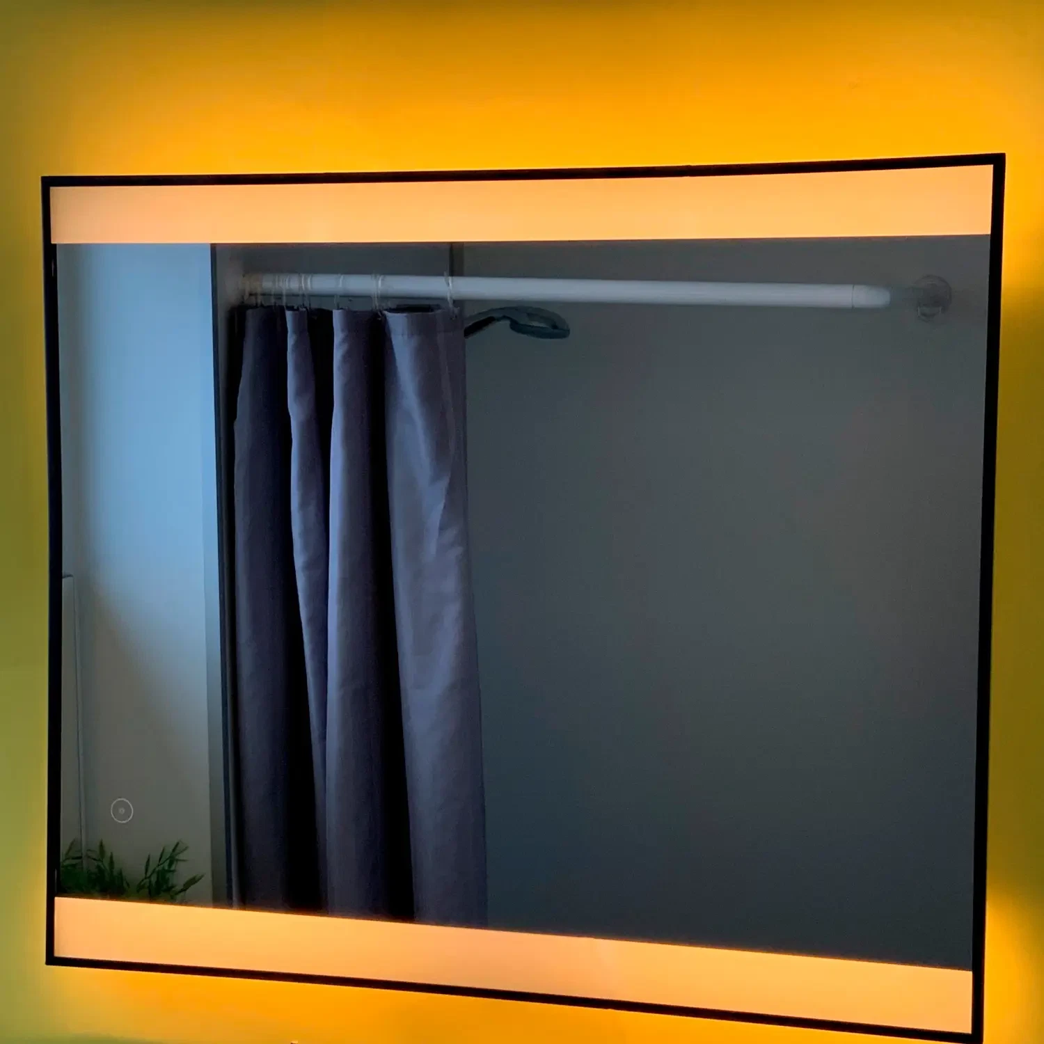 Spejl med oplyste, matterede kanter som lyser. Kan monteres liggende eller stående.