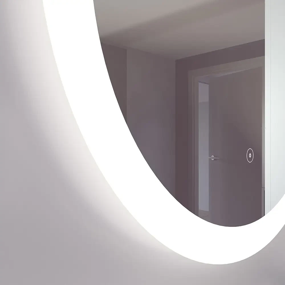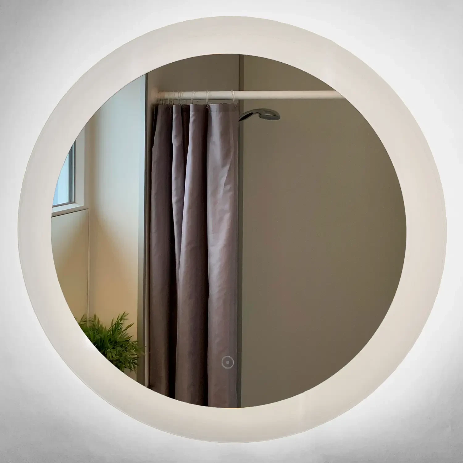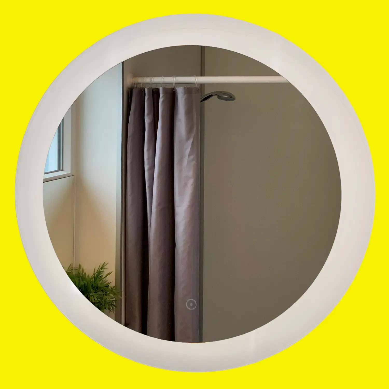 Rundt og harmonisk spejl med LED lys i den matterede ramme. Med en touch knap der kan tænde, slukke, dæmpe og i høj lyskvalitet.