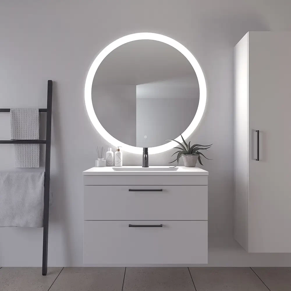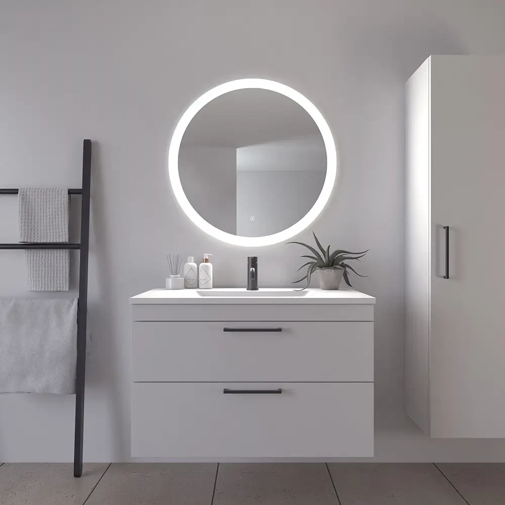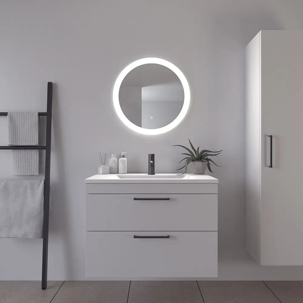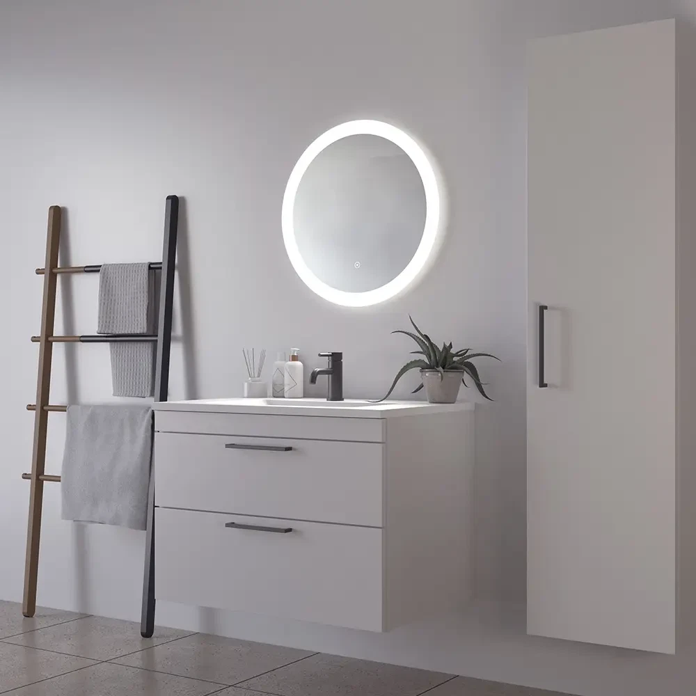 Rundt og harmonisk spejl med LED lys i den matterede ramme. Med en touch knap der kan tænde, slukke, dæmpe og i høj lyskvalitet.