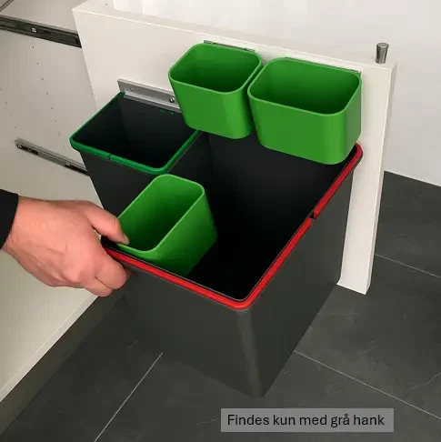 På den måde kan du i selv et lille skab skabe plads til affaldssortering, ved at hænge affaldsspanden op på en af vores  basisplader med udtræk i hvid eller basisplader med udtræk grå.