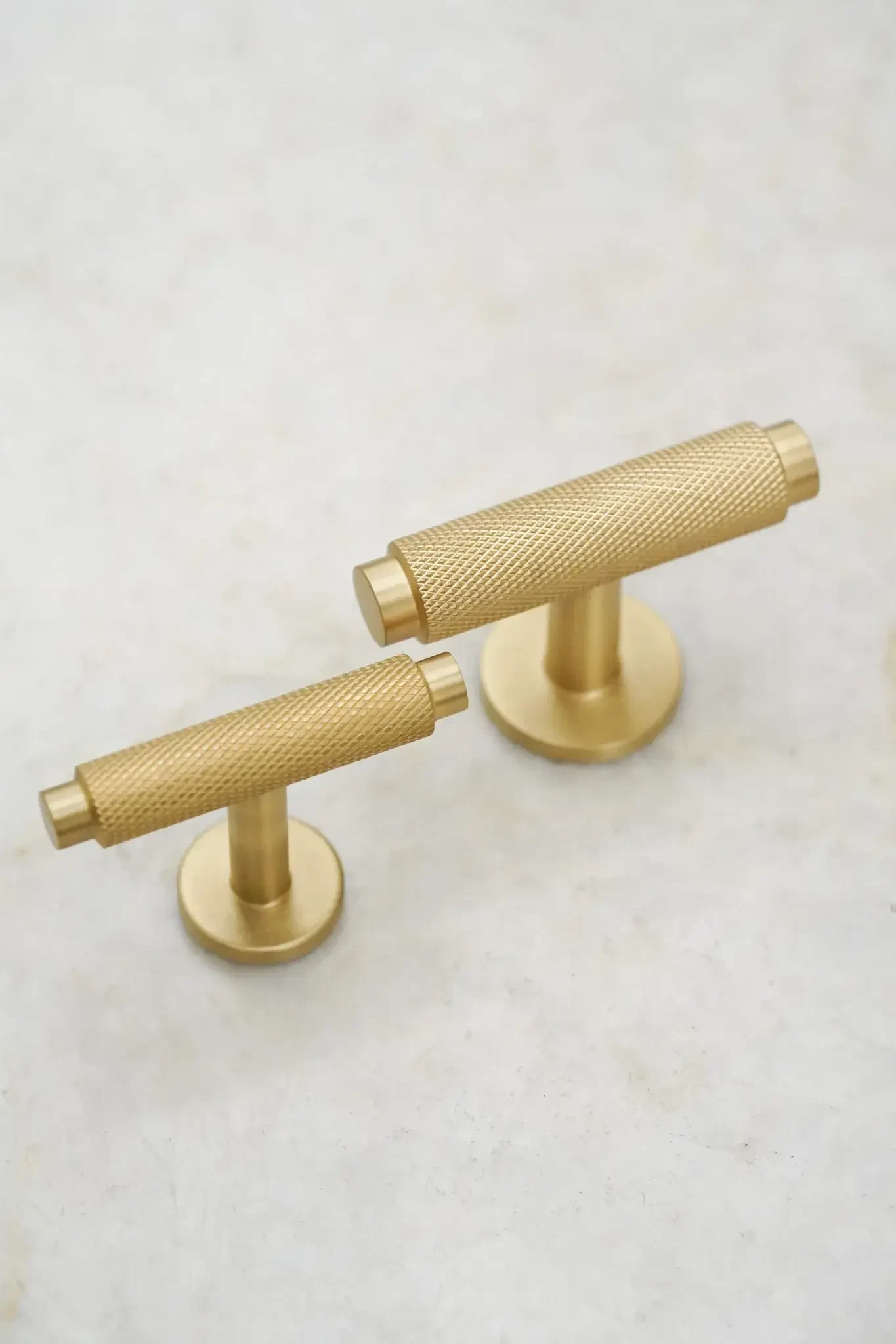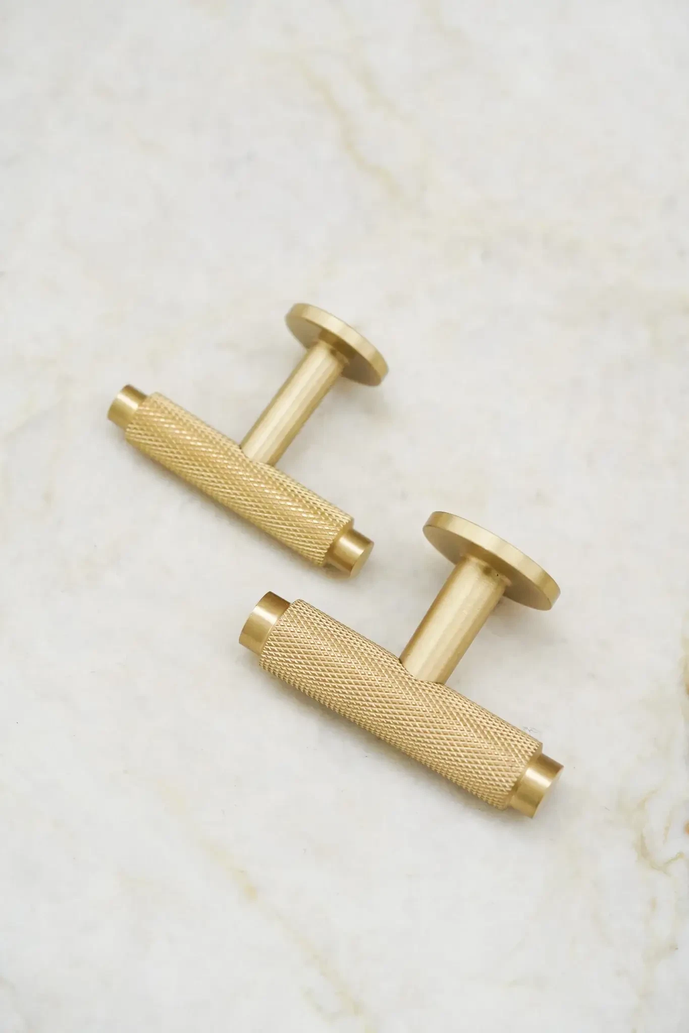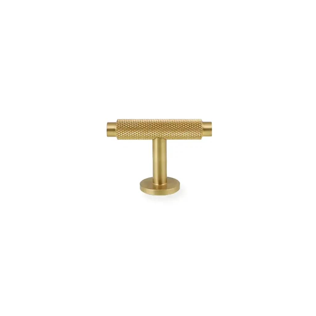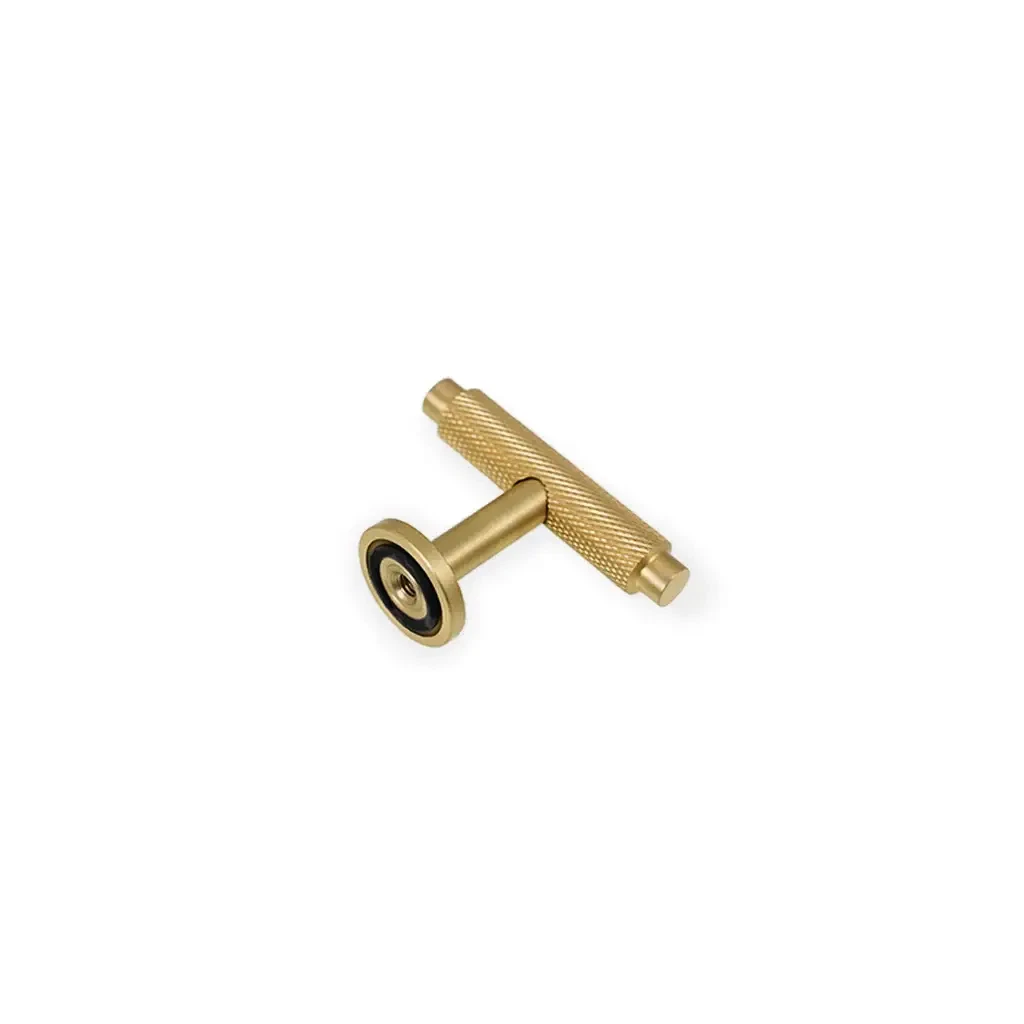 Knopper T-bar i børstet massiv messing, med lak 50mm