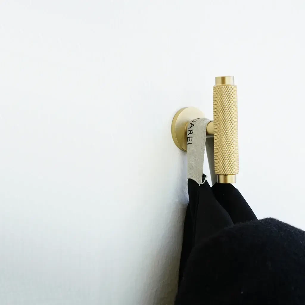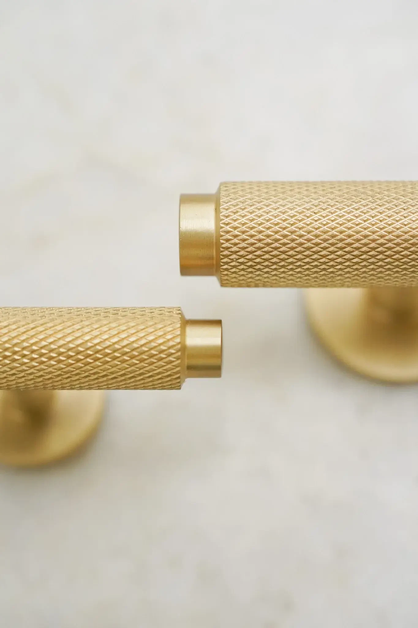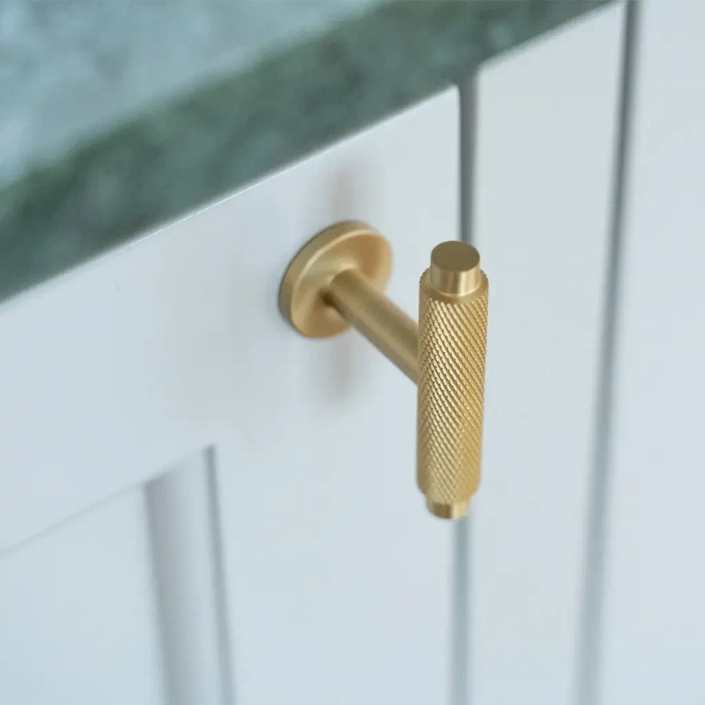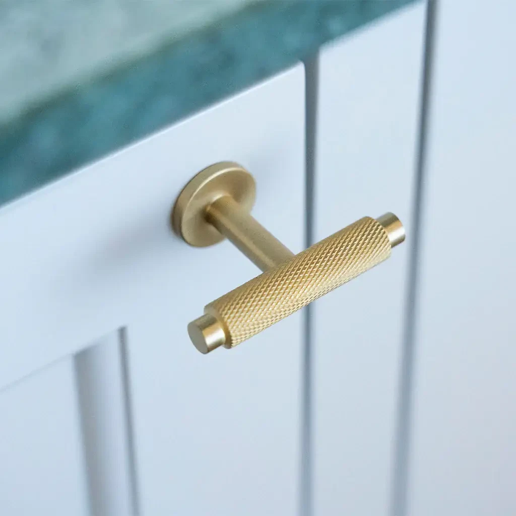 Knopper T-bar i børstet massiv messing, med lak 50mm