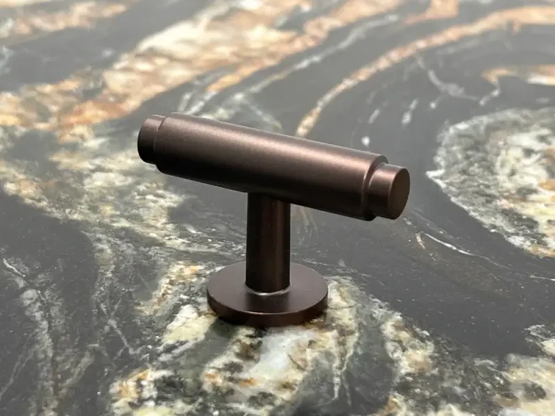 Knopper til skabe og fronter, T-bar greb i bruneret messing et stilfuldt design og med en glat overflade.