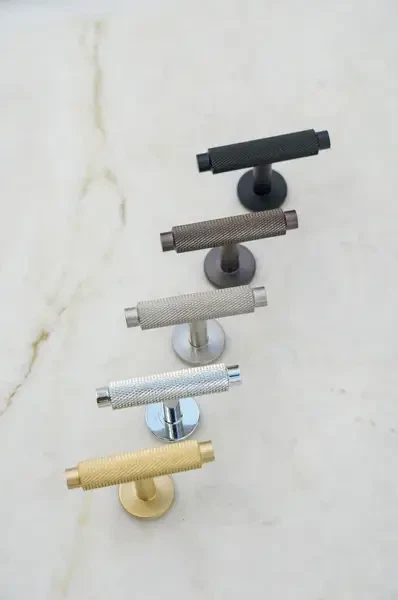 Knoppen findes også med andre overflader som - messing uden lak - messing med lak -  rustfri stål look - bruneret messing -blank krom