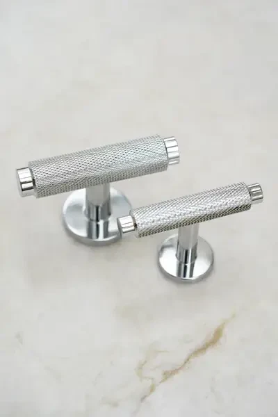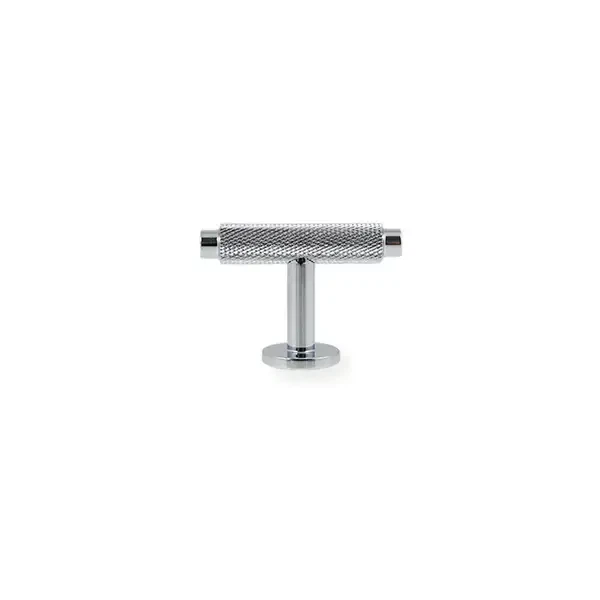 Møbelknop T-bar med diamond cut, i blank krom og med riflet overflade.