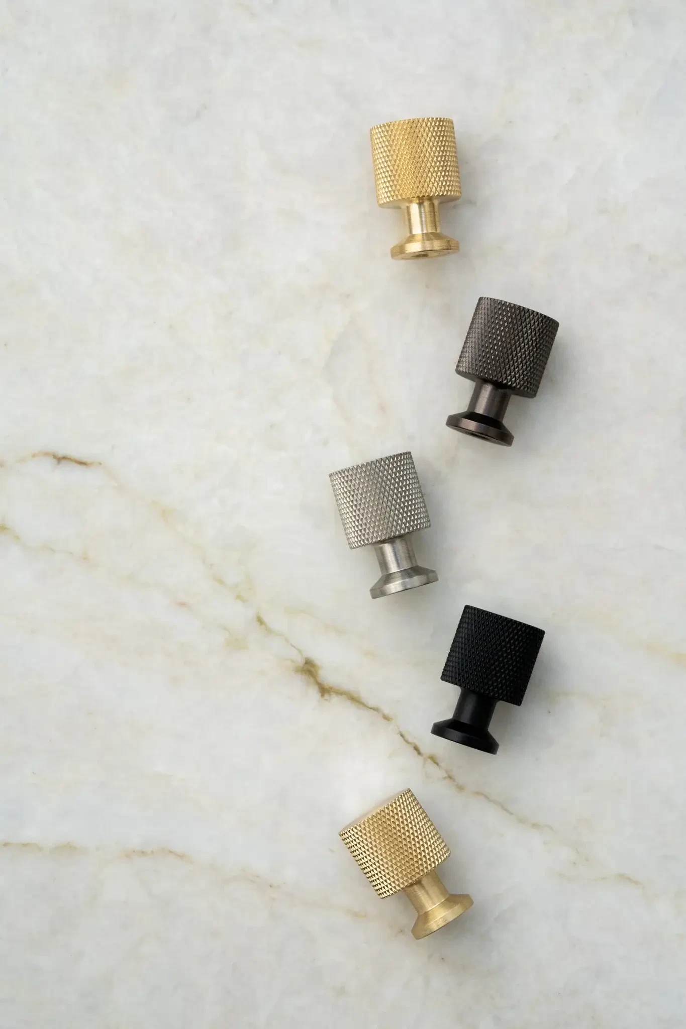 Knoppen findes også med andre overflader som messing uden lak - messing med lak - rustfri stål look - i sort.