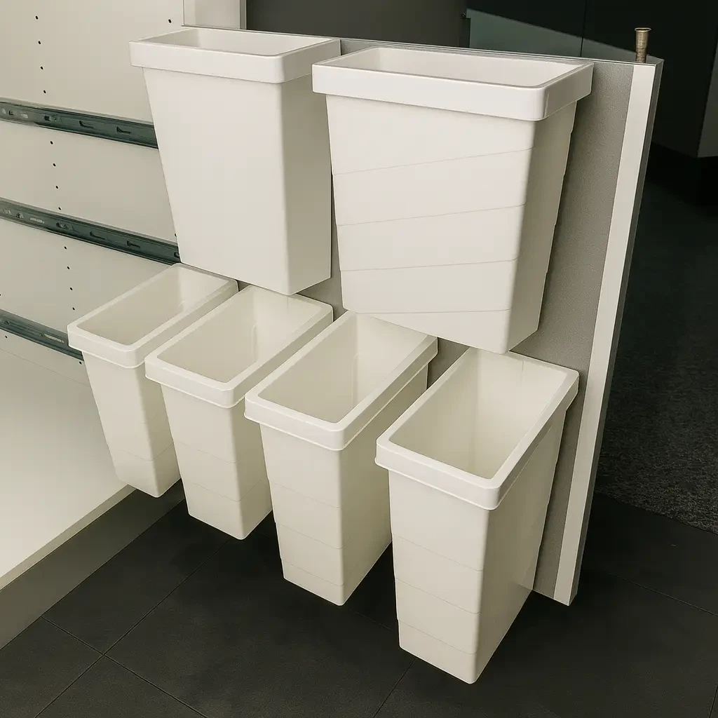 Du har muligheden for lave affaldssortering i køkkenet på mål. Du bygge din eget affaldssortering  op, ved hjælp af vores byg selv affaldssystemer. Du bestiller de antal affaldsspande du skal bruge og monterer dem på vores udtræks basisplade som finde i hvid og grå. Herpå monteres dine affaldspande op i ønskede størrelser, på bred eller smal side.