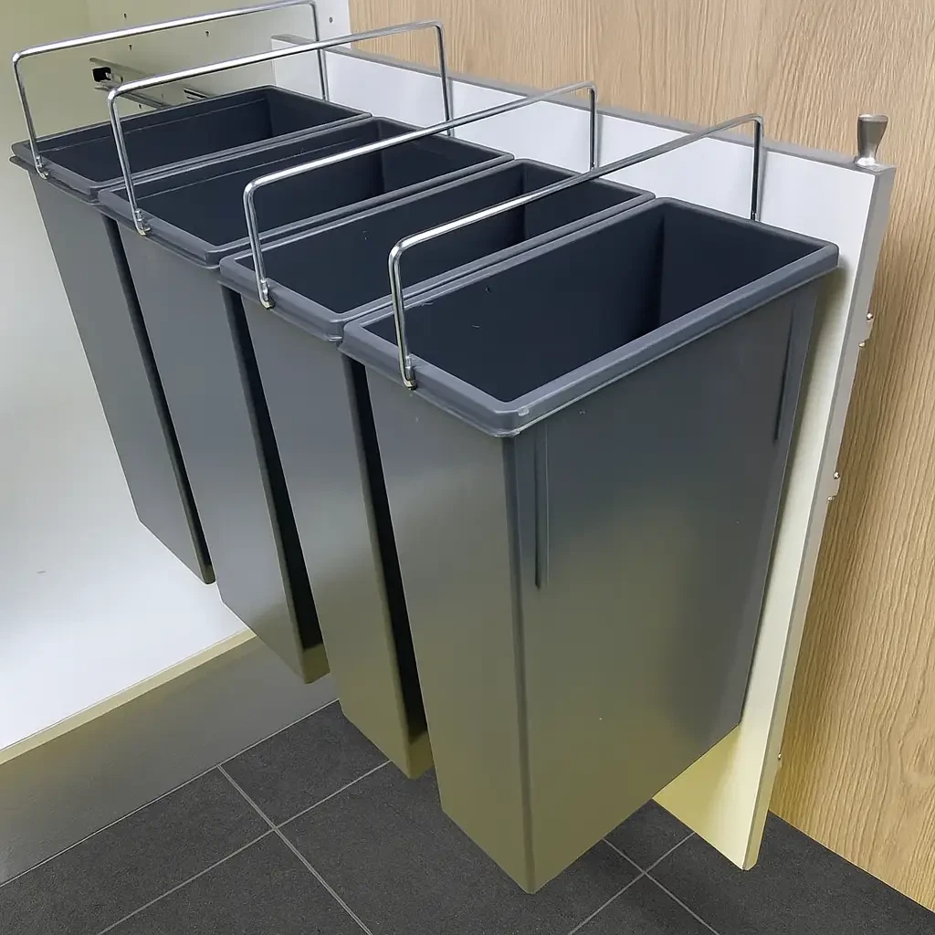 En smart ide er at monterer affaldsspandene på en udtræksplade, så du kan trække alle spande ud på en gang. Se mere i vores Byg selv affaldssystemer.