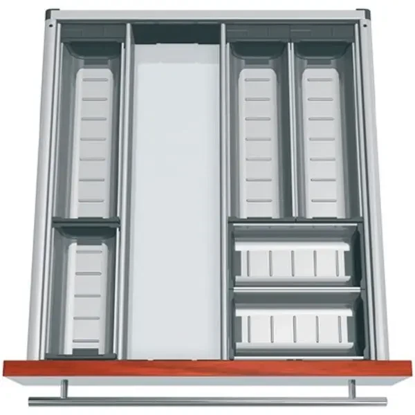 Bestikinddeling af høj kvalitet med skåle i rustfri stål. Bestikskålene kan sammensættes individuelt og er udtagelige. De kan således tages ud ved brug til f.eks. buffet eller havefest. Skålene kan tåle at komme i opvaskemaskinen.