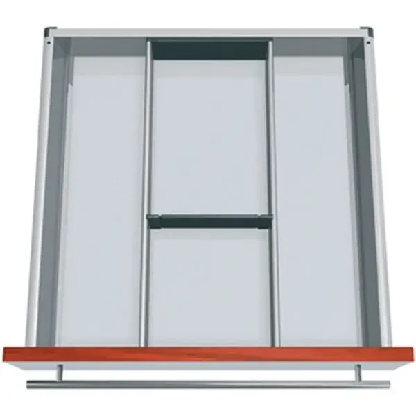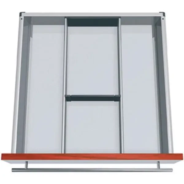 Bestikinddeling af høj kvalitet med skåle i rustfri stål. Bestikskålene kan sammensættes individuelt og er udtagelige. De kan således tages ud ved brug til f.eks. buffet eller havefest. Skålene kan tåle at komme i opvaskemaskinen. Denne bestikindsats er specielt velegnet til større køkkenredskaber. Der er også plads til 1 stk. knivholder eller alu/folie dispenser.