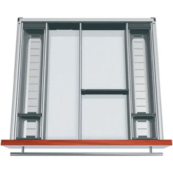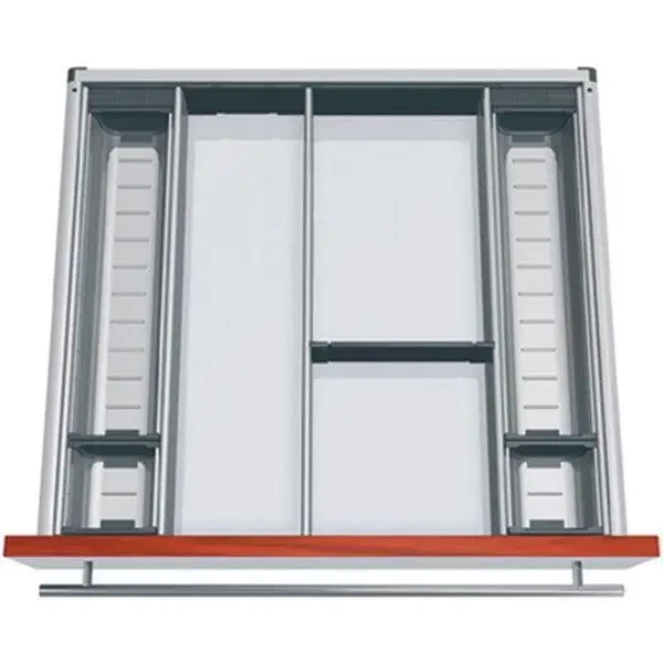 Bestikinddeling af høj kvalitet med skåle i rustfri stål. Bestikskålene kan sammensættes individuelt og er udtagelige. De kan således tages ud ved brug til f.eks. buffet eller havefest. Skålene kan tåle at komme i opvaskemaskinen. Denne bestikindsats er specielt velegnet til større køkkenredskaber. Der er også plads til 1 stk. knivholder eller alu/folie dispenser.