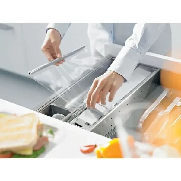 Denne dispenser til husholdningsfilm passer i inddelingssystemerne fra Orga-Line. Slip for at bøvle med husholdningsfilmen ved at bruge denne dispenser man nemt kan skære filmen over med.