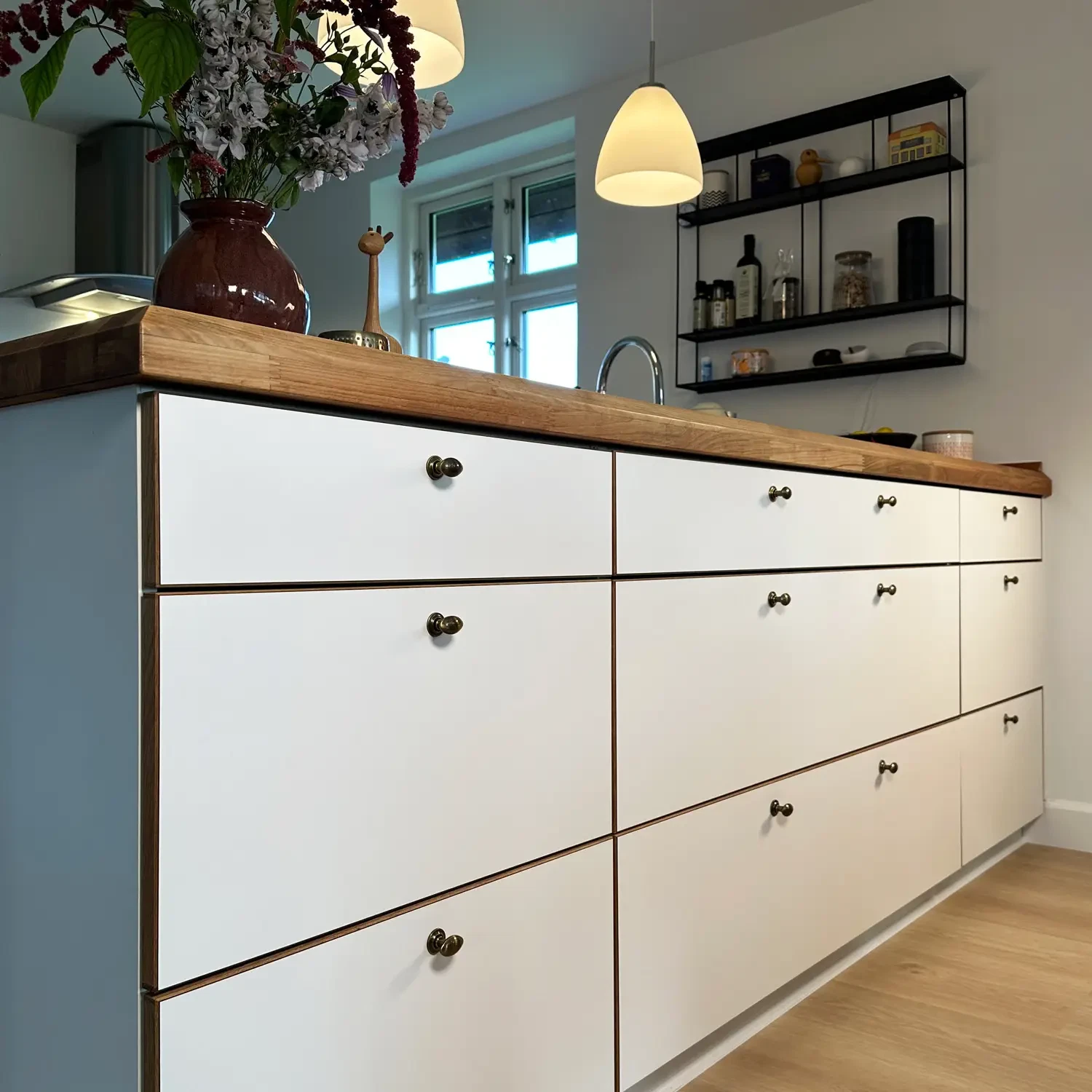 Her kan du se Oval antik messing grebet færdigmonteret i et køkken. Lågerne hedder "Sæby".