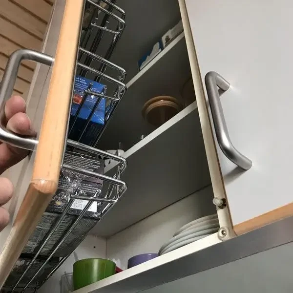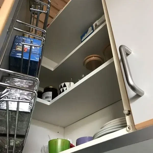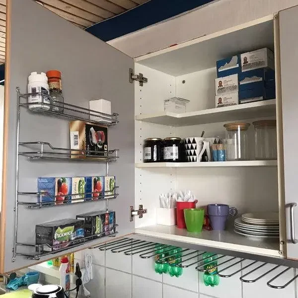 Med denne tilpasset hylde er der plads til en krydderihylde på lågen af skabet. Derved udnytter man maksimalt opbevaringsmuligheden i skabet.