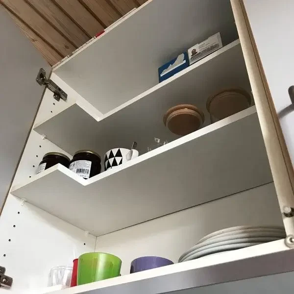 Hylden er beregnet til overskabe sammen med krydderihylde. Vi tilskærer hylden så der er plads til krydderihylden i dit skab.