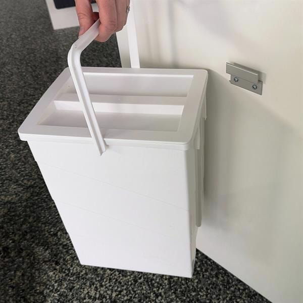 • Har du en 60 cm bred låge, kan der hænge 2 spande ved siden af hinanden. Naturligvis under forudsætning af at der er plads for f.eks. vask og rørføring
