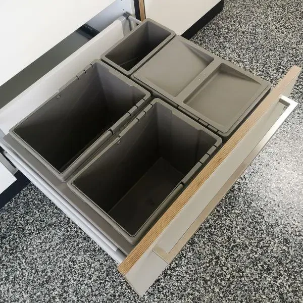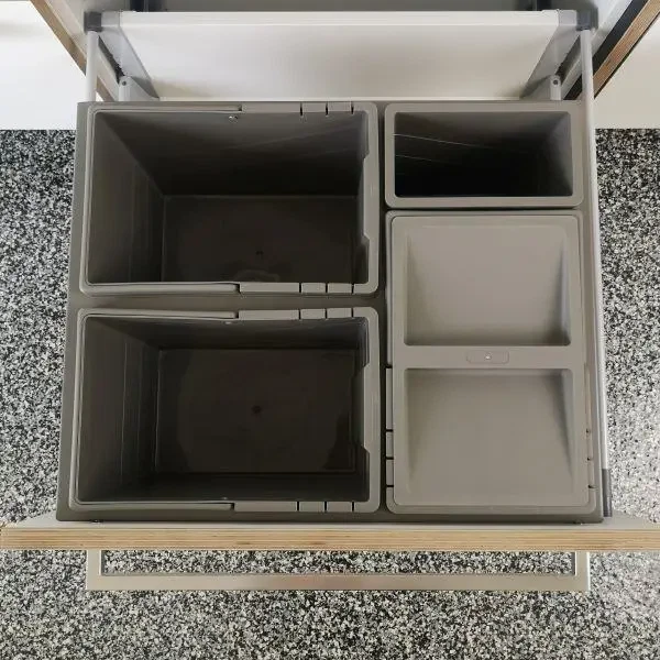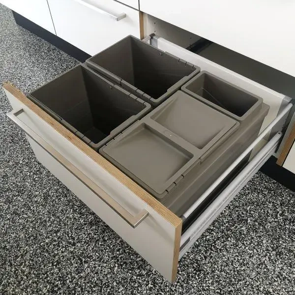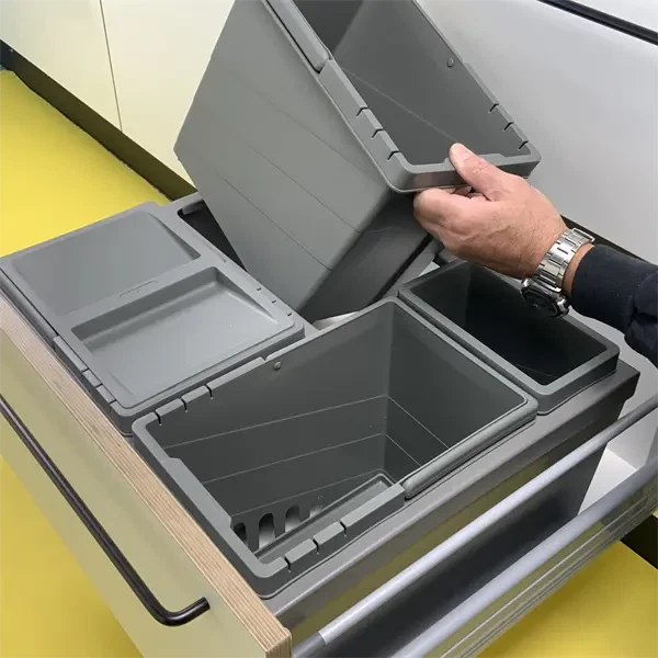 En smart måde at sortere affald på til dig, der har mulighed for at benytte en skuffe til affaldssortering. Dette affaldssystem er til en standard skuffe på 60 cm i bredden. Der medfølger 3x11 liter affaldsspande med hank og 1 x låg. En af spandene  er en biospand med lufthuller til madaffald/grønt affald. De to andre kan bruges til restaffald, hård plast, papir mv. Yderligere medfølger der 1x 3 liter spand til sortering af f.eks. batterier, metal eller andet. Spandene kan nemt løftes op af systemet for at tømme eller rengøre affaldsspandene.