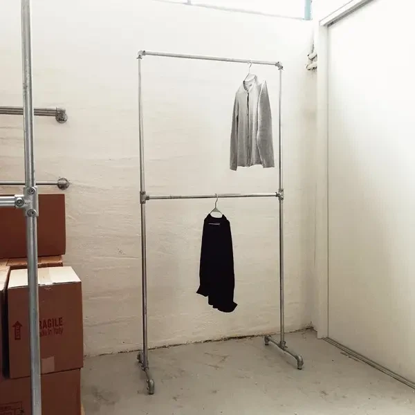 Denne garderobe serie er meget rå og rustik. Tøjstativer af vandrør / jernrør / vvs rør er en stigende trend i boligindretning, og falder under stilen industriel design eller new york loft. Det nøgne og rå look passer godt til de nordiske og milde lyse indretningstendenser, som mange har derhjemme. Samtidig kan det skabe et godt modspil til en feminin indretning, og se meget flot ud på en drengeværelse eller teenageværelse.