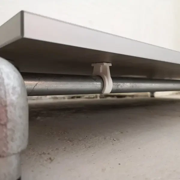 Pladen består af en microlaminatoverflade med køligt betonlook og alu-kant af ABS, som passer i farven til stativet. Pladen står stabilt på de to bundstænger og fastklipset fire steder. Pladen kan klipses af og på stativet.