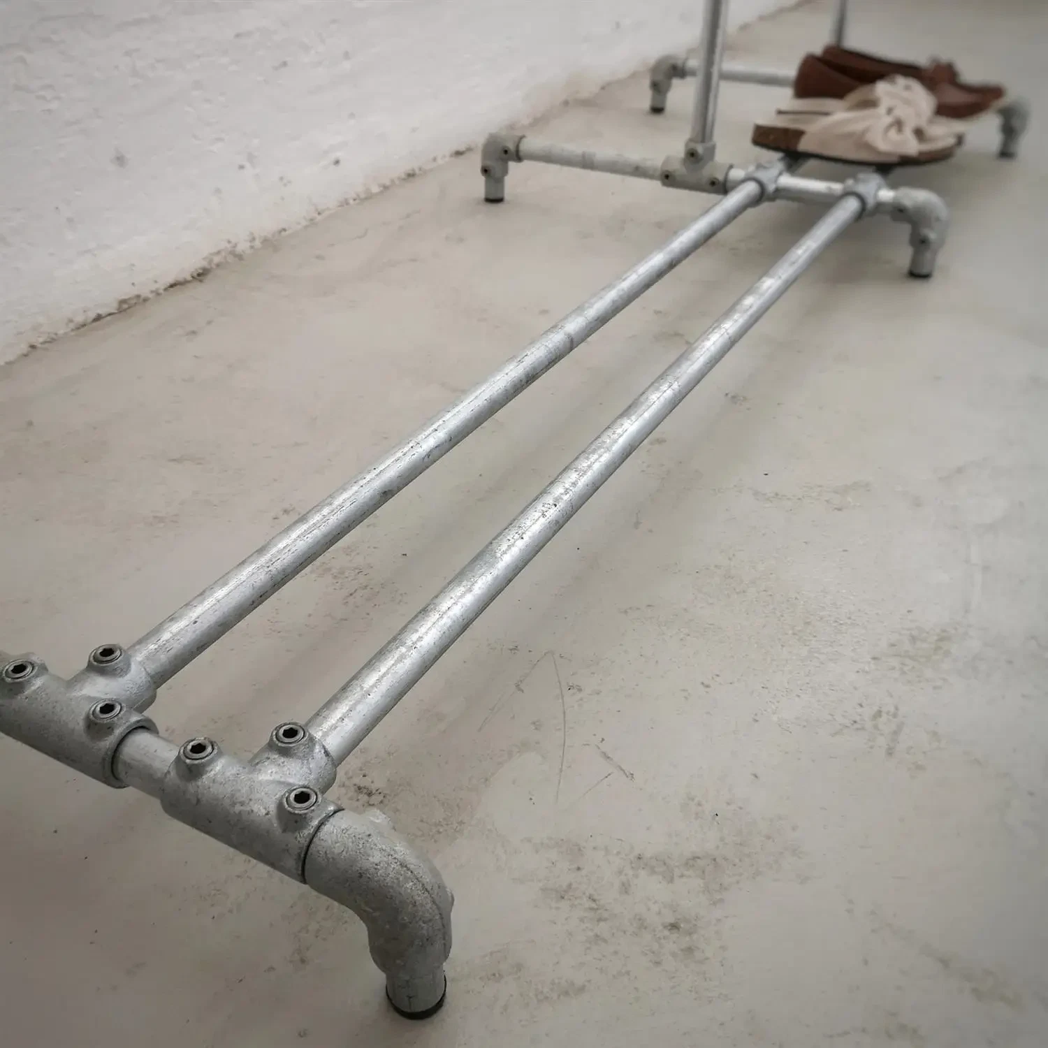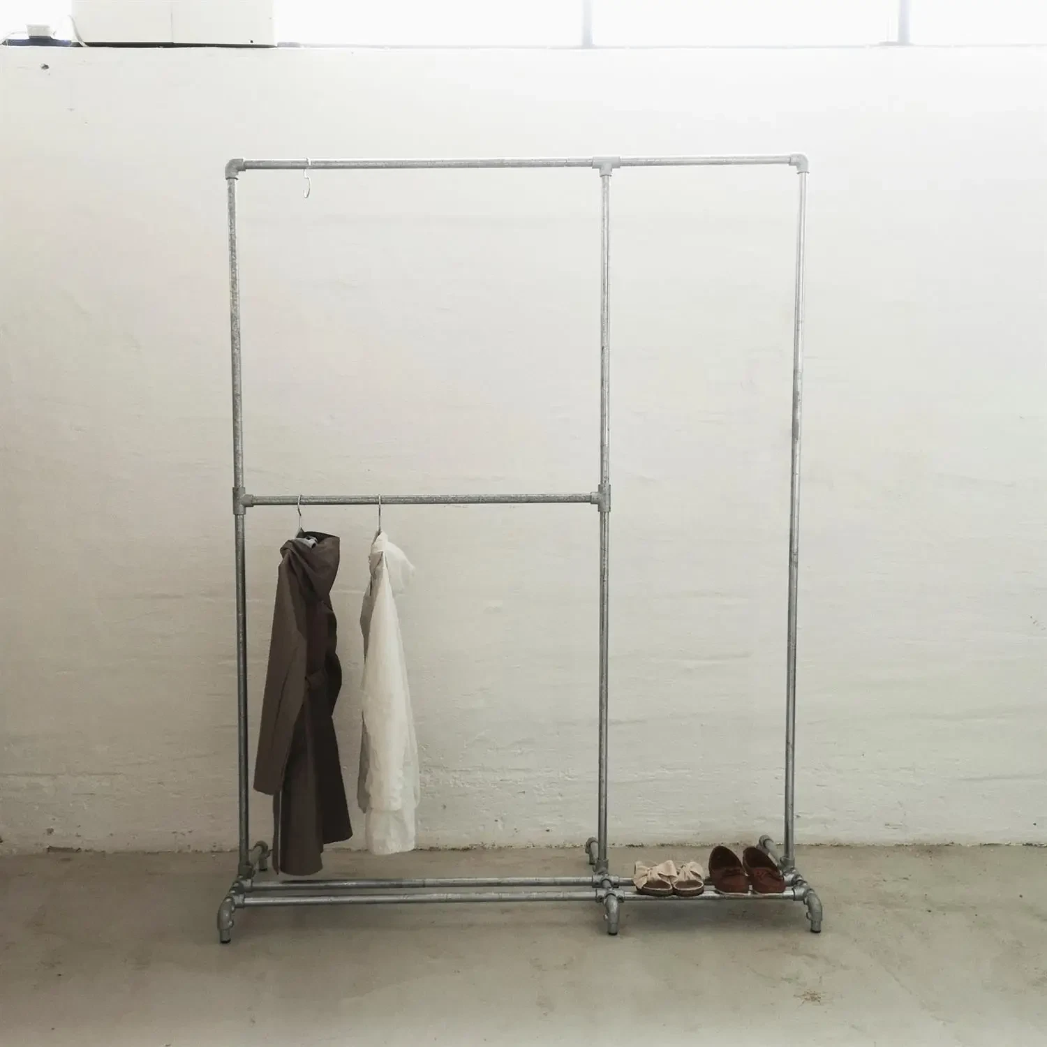 Minimalistisk og råt tøjstativ som kan rumme hele garderoben, samt både kort og langt tøj og en enkelt række sko eller tasker på de nederste rør.