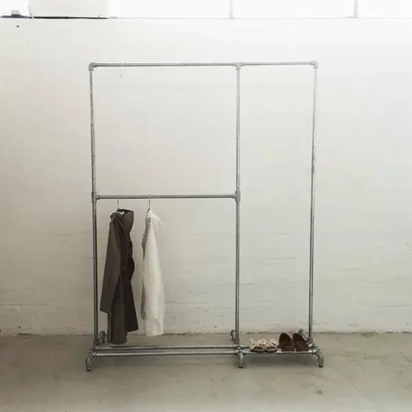 Denne garderobe serie er meget rå og rustik. Tøjstativer af vandrør / jernrør / vvs rør er en stigende trend i boligindretning, og falder under stilen industriel design eller new york loft. Det nøgne og rå look passer godt til de nordiske og milde lyse indretningstendenser, som mange har derhjemme. Samtidig kan det skabe et godt modspil til en feminin indretning, og se meget flot ud på en drengeværelse eller teenageværelse.
