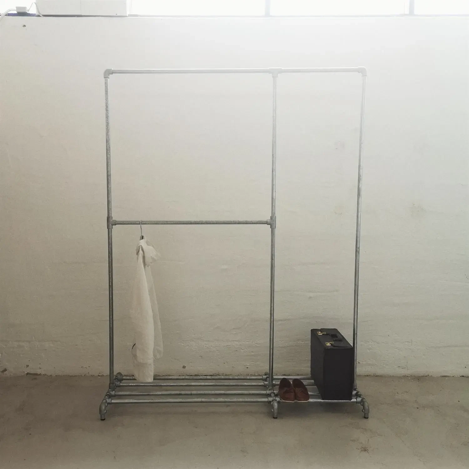 Minimalistisk og råt tøjstativ som kan rumme hele garderoben, samt både kort og langt tøj samt to rækker sko eller tasker på de nederste rør.